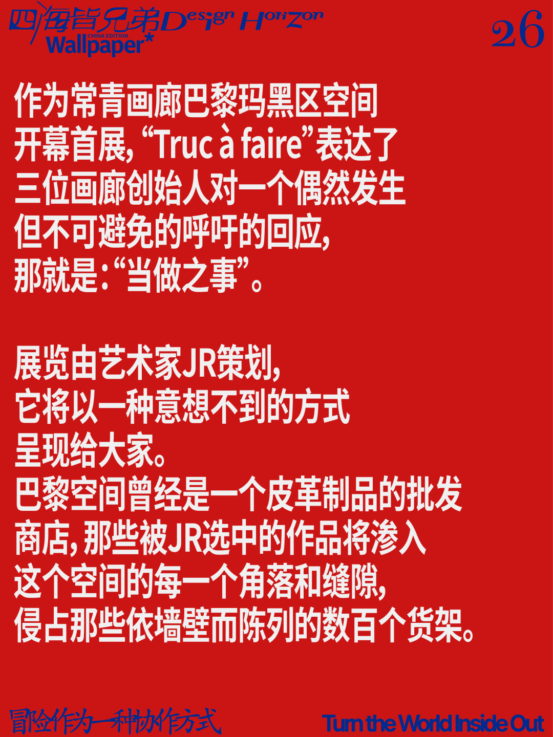 无论是画廊主Lorenzo对边远“小镇”的艺术介入,还是艺术家JR对城市建筑肌理的长期关注,他们的实践与合作建立在一种深层的共识之上——艺术激发的内在力量和好奇心,以及对不同的尊重。相同的使命感与共同的愿景驱动他们展开协作,一起冒险,互相支持,也让“四海皆兄弟”的理想并非遥不可及。