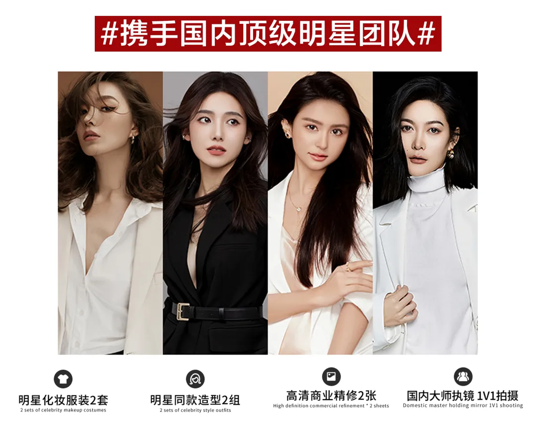 【精致造型】商务形象+明星肖像各1套,包括服装搭配和形象妆容设计。