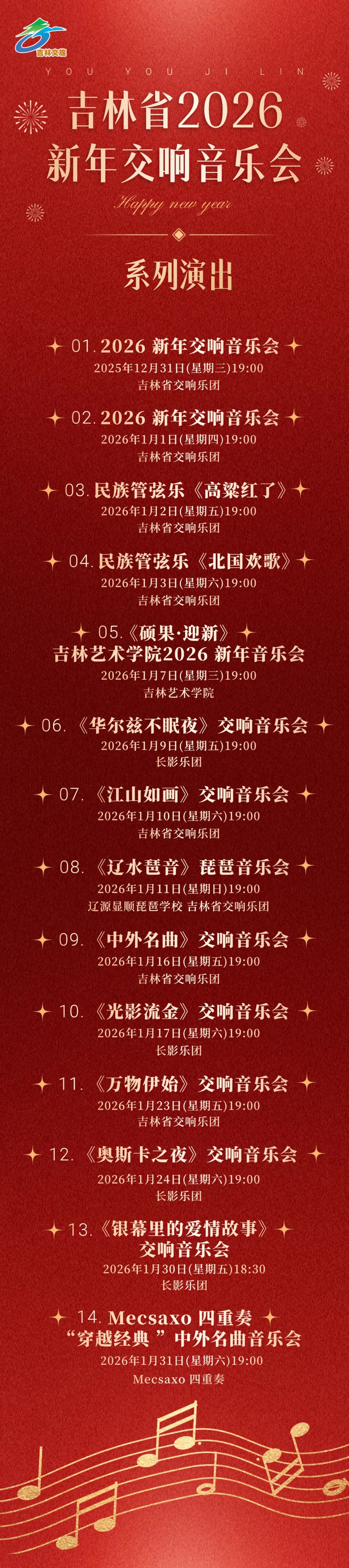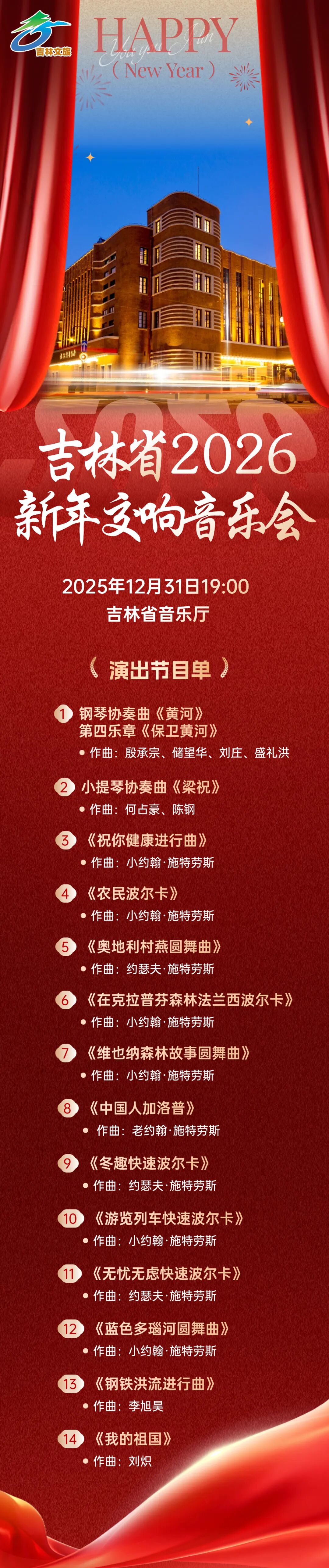 没买到票的观众不要紧!在即将举行的吉林省2026新年交响音乐会系列演出上,不仅有国内经典旋律悠扬回荡,也有世界名曲经典重现,更有吉林特色曲目彰显地域风情。不同风格的音乐碰撞交融,编织出别具一格的听觉图景。关注吉吉,为您随时更新开票信息!