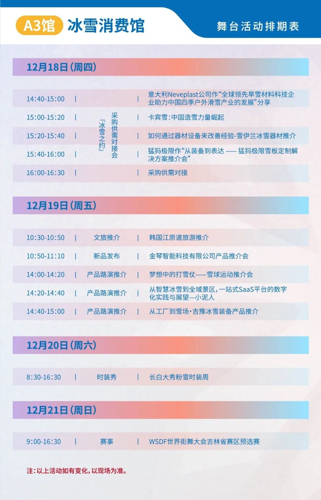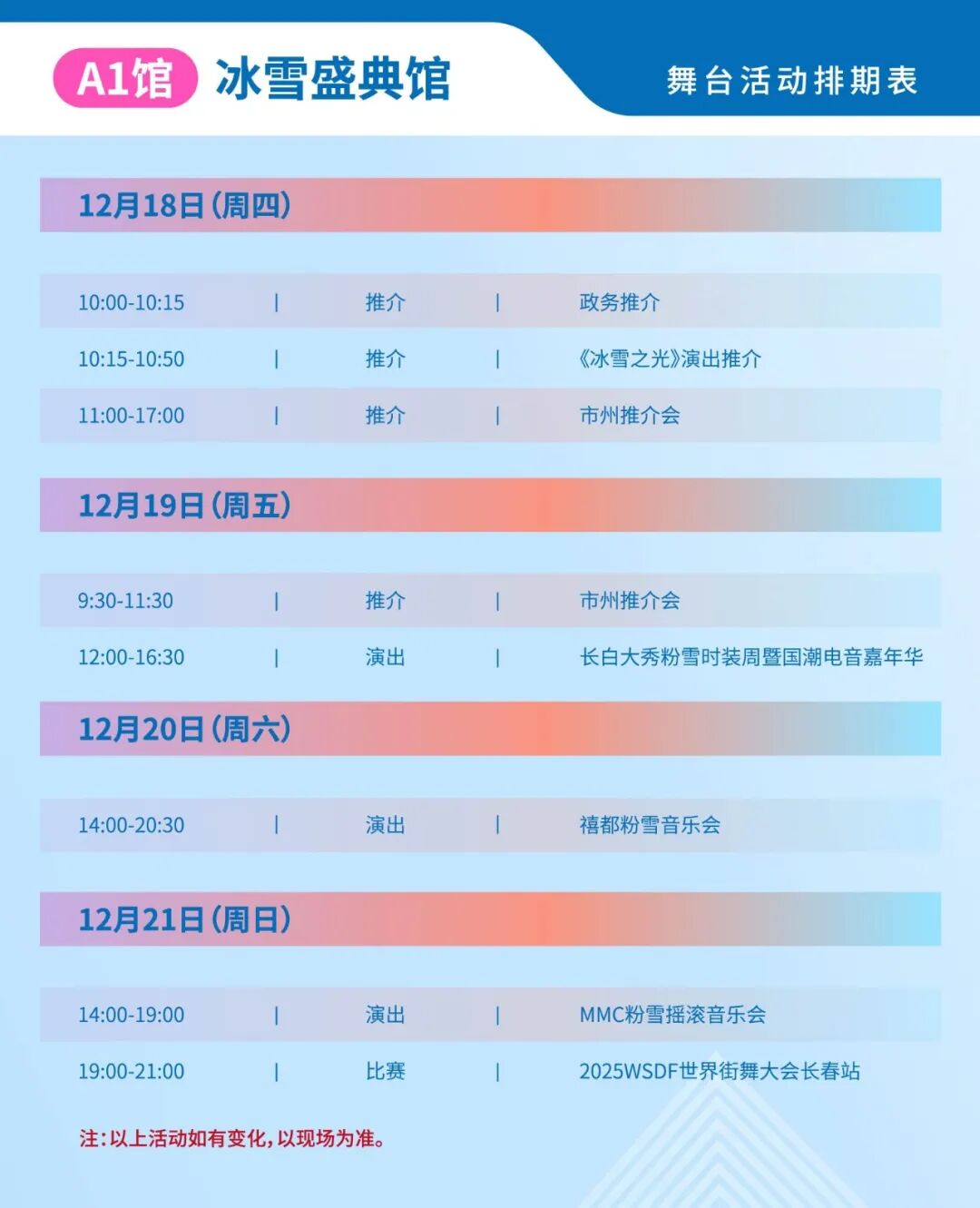A1馆“冰雪盛典馆”打造日夜不停的冰雪+音乐嘉年华,主打的就是活动多多,演出多多!创新打造《冰雪之光》文旅推介演出,一场长白大秀电音嘉年华,两场粉雪音乐节,一场世界街舞大赛,燃动雪博会!更有市州推介会不间断给你惊喜,每天都是不同画风的“快乐星球”!