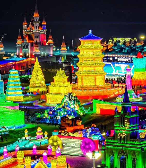今年主题为“冰雪福耀中华・民族大团结”,把全国各省市地标搬进了冰雪世界,让游客在冰天雪地中感受中华民族大家庭的团结与友谊!