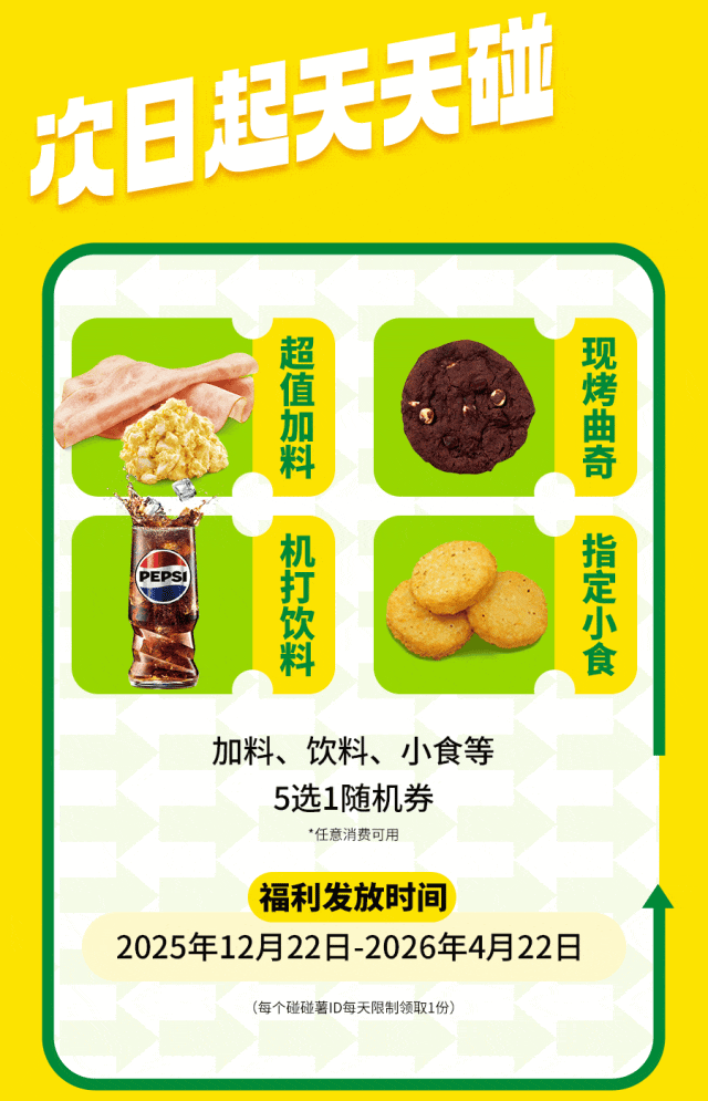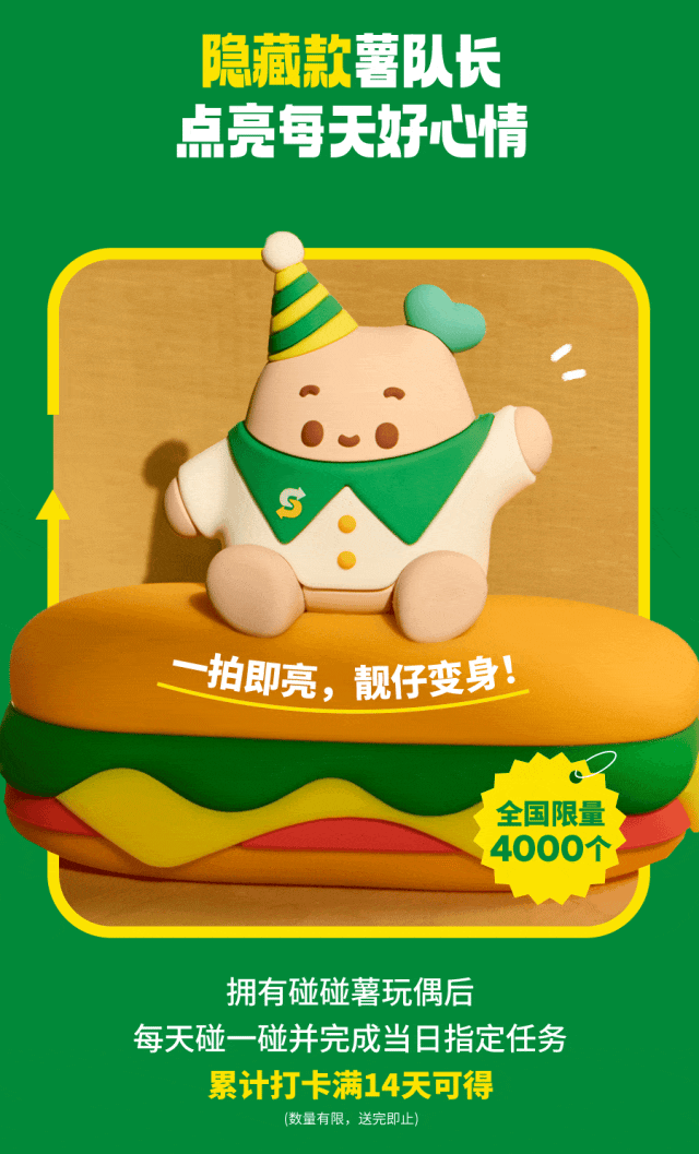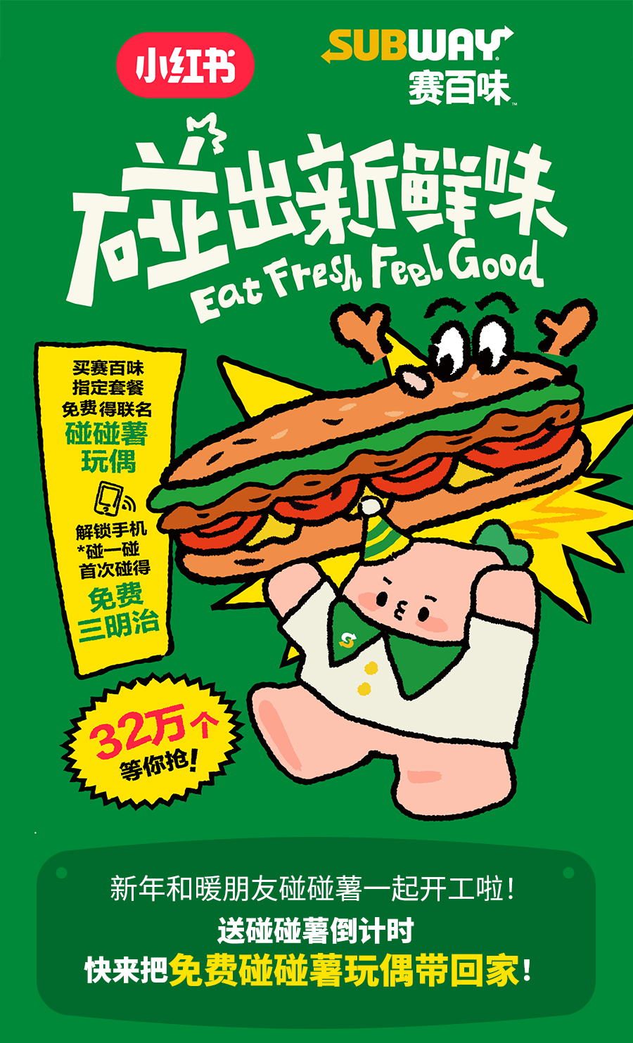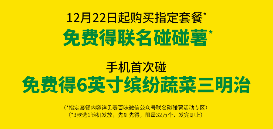 上述活动限2025年12月22日起于SUBWAY®赛百味中国大陆地区部分餐厅供应,机场、火车站等交通枢纽餐厅、旅游景区餐厅、园区内部餐厅等特殊餐厅除外,具体以餐厅公示为准。产品、周边以实物为准,以上为创意图片,仅供参考。活动期间,购买指定套餐可免费加购赛百味小红书联名碰碰薯玩偶1份(下称“碰碰薯”,该活动机制仅适用于赛百味支付宝小程序,赛百味微信小程序及线下门店柜台点单,不适用于第三方外卖平台、大众点评、抖音等其他网上订餐渠道)。指定套餐含早餐套餐、能量碗套餐、三明治/百味卷三/四件套、健盈卡三明治二件套、儿童餐、多人餐(下午茶套餐、三明治/百味卷二件套、eteecy联名套餐等除外,具体详见小程序菜单);碰碰薯全国共限量32万份,数量有限,发完即止。碰碰薯共3款(好饭有好报薯队长挂件玩偶、工位饱贝薯队长摆件玩偶、吃得好薯队长摆件玩偶),随机发放,当日款式以餐厅实际供应为准。免费三明治指首次碰可领取“0元赛百味6英寸标准配方缤纷蔬菜三明治”电子优惠券1张,免费福利指次日起每日碰可领取0元惊喜券1张,凭券可免费兑换小食、饮品、曲奇等。每个碰碰薯每日仅可领取一份福利,单日不可重复领取。福利优惠券的具体有效期、使用规则等请查看券面说明。碰碰薯的具体权益领取规则详见赛百味微信公众号菜单栏 - 新鲜放送 - 联名碰碰薯活动,SUBWAY赛百味可以在法律允许的范围内对活动进行适当调整。Subway® is a Registered Trademark of Subway IP LLC © 2025 Subway IP LLC.