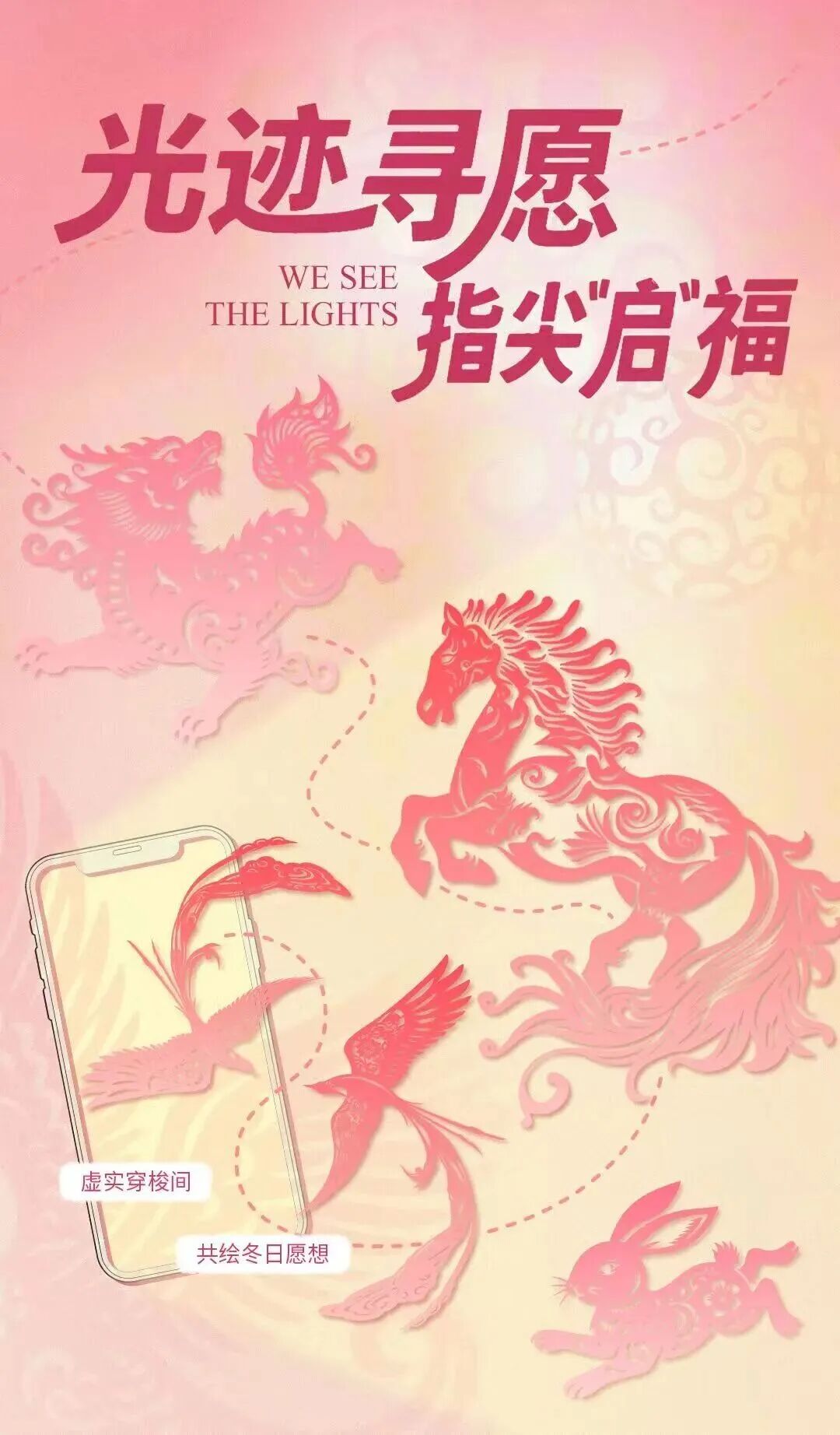 除了直播活动,蓝色港湾还为您准备了持续整个冬季的浪漫体验——第十八届灯光节,传统剪纸艺术与AR光影科技巧妙融合,开启一段虚实交织的寻忆之旅。以“福禄寿喜财”为主题的六只剪纸瑞兽,散落在蓝港的各个角落,寄托着满满的新年祝愿。“纸韵财生”瑞气之树与“十二花令花卷”一生一期,用极简线条勾勒东方生长之美。