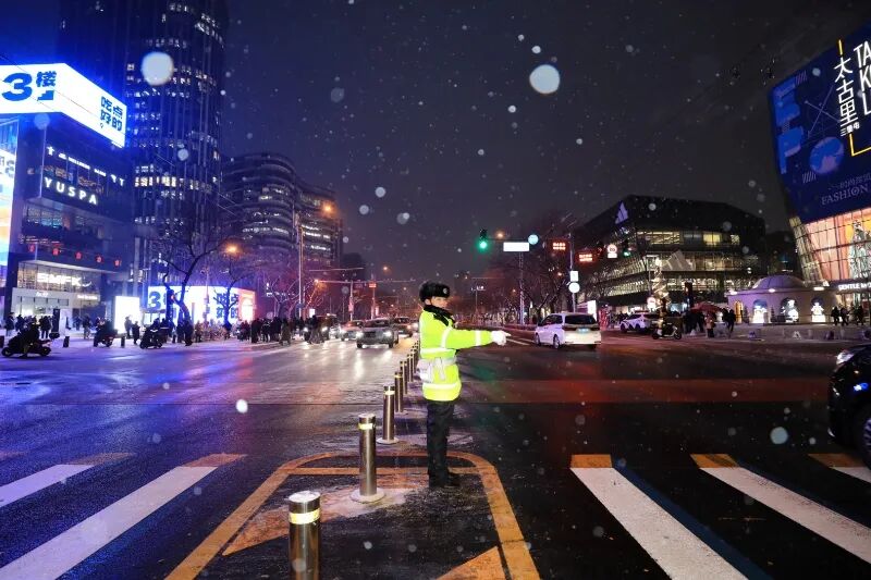 黑夜中,交警们指挥着交通秩序