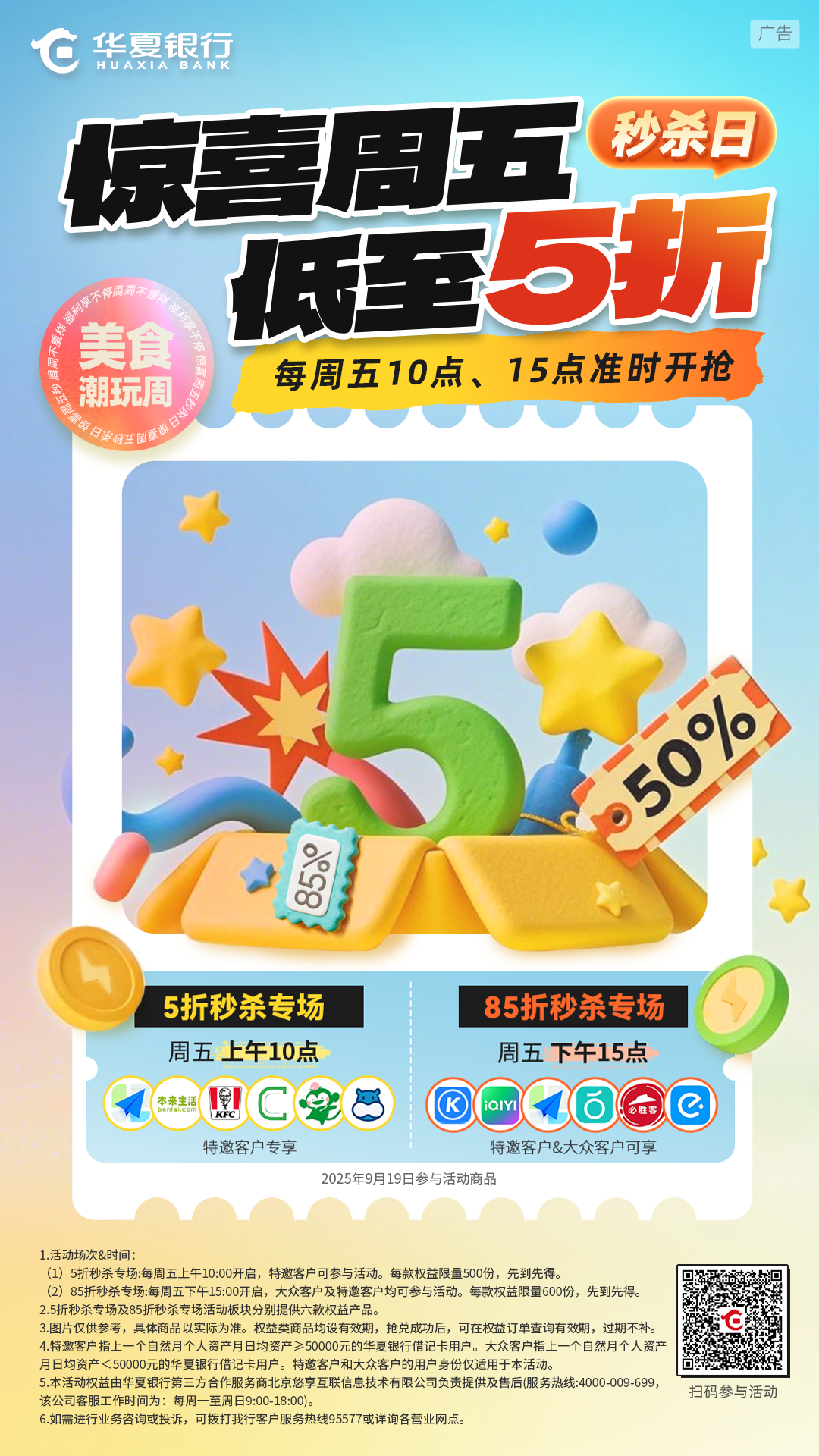 识别上方海报二维码→登录【华夏银行APP】→【惊喜周五】→【兑换权益】