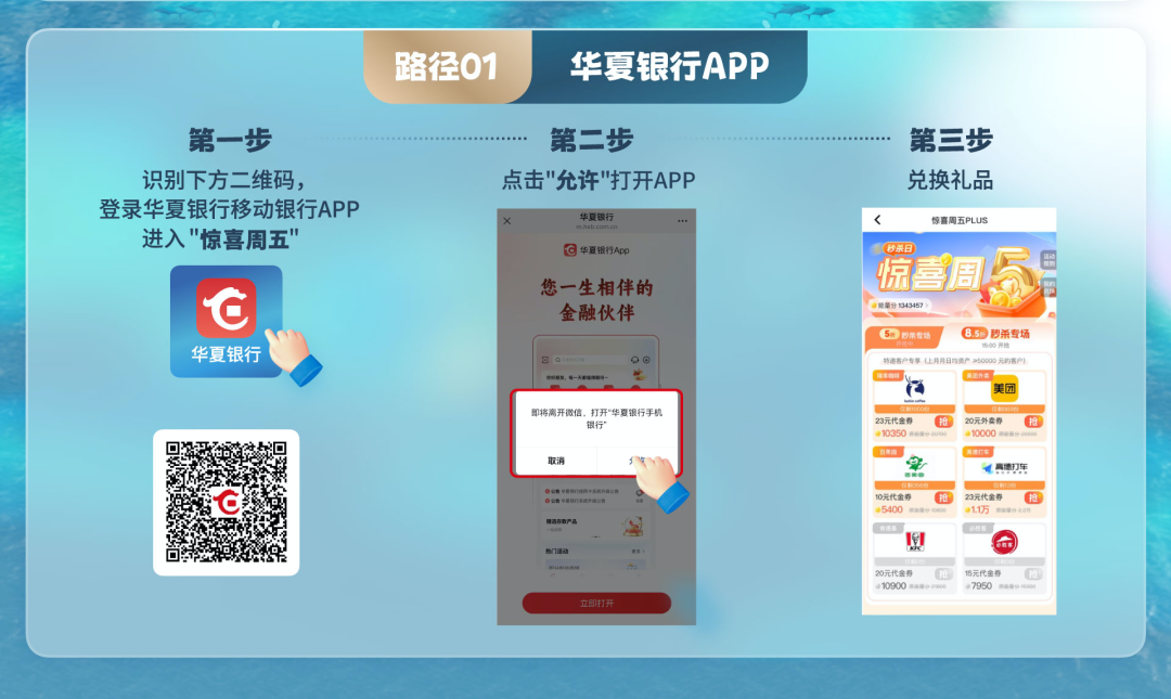 识别上方海报二维码→登录【华夏银行APP】→【惊喜周五】→【兑换权益】