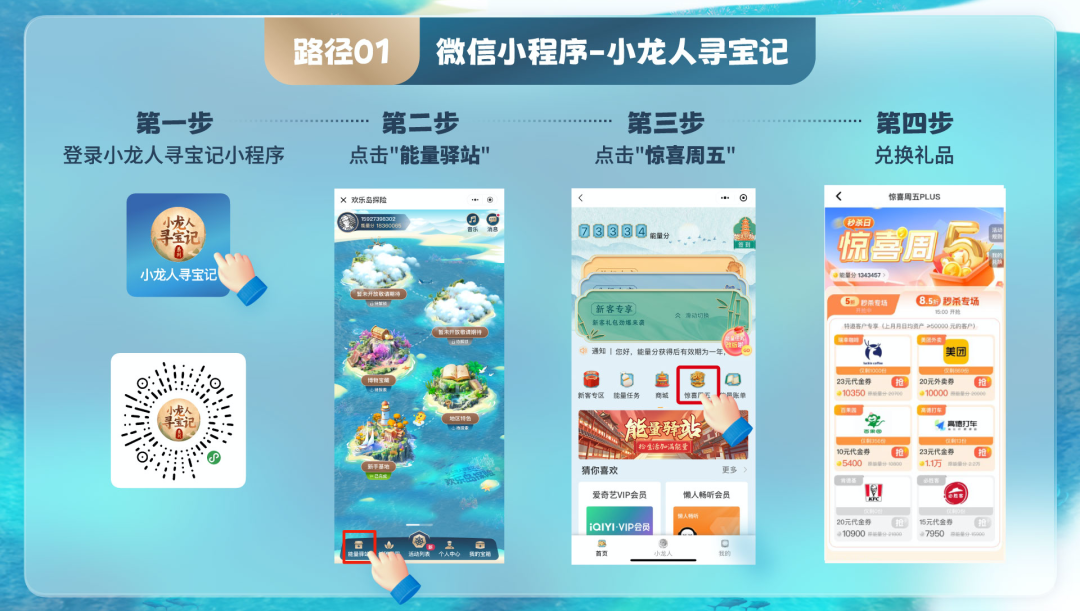 识别图中小程序码→进入“小龙人寻宝记”→点击【能量驿站】→【惊喜周五】→【兑换权益】