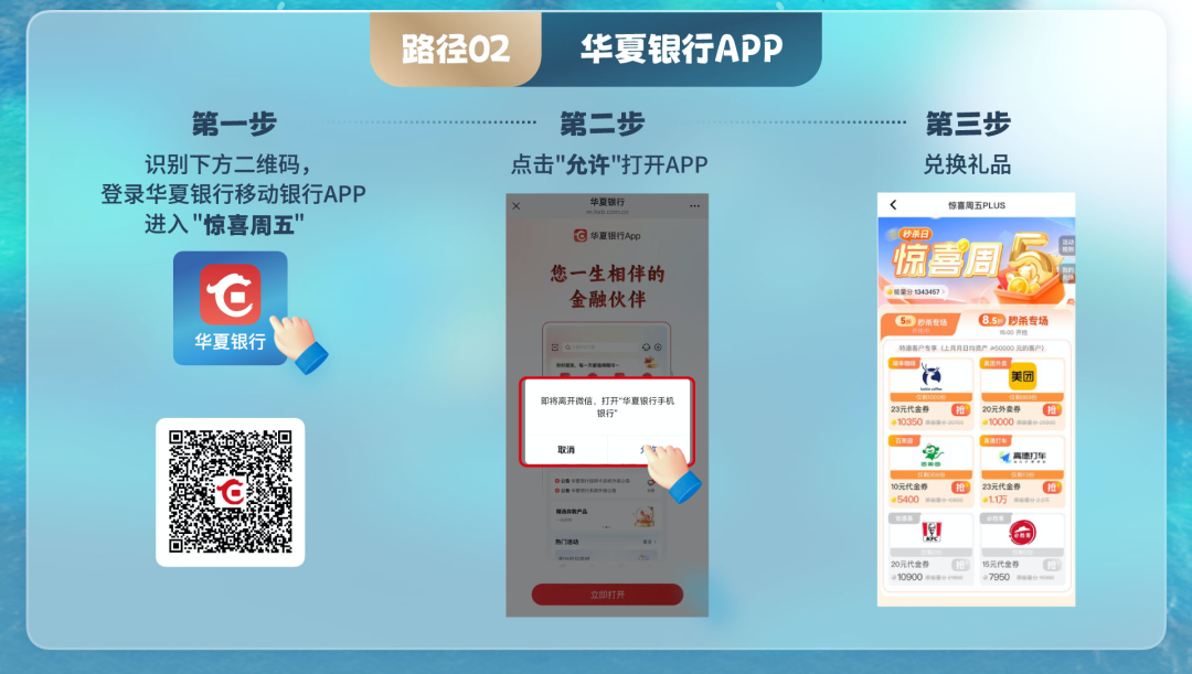 识别上方海报二维码→登录【华夏银行APP】→【惊喜周五】→【兑换权益】