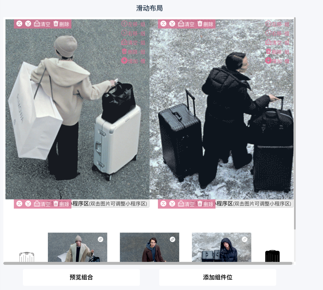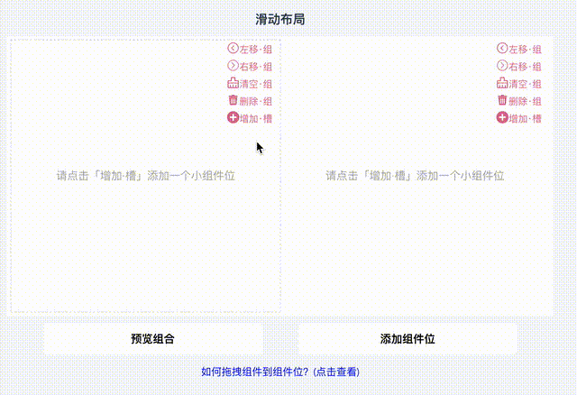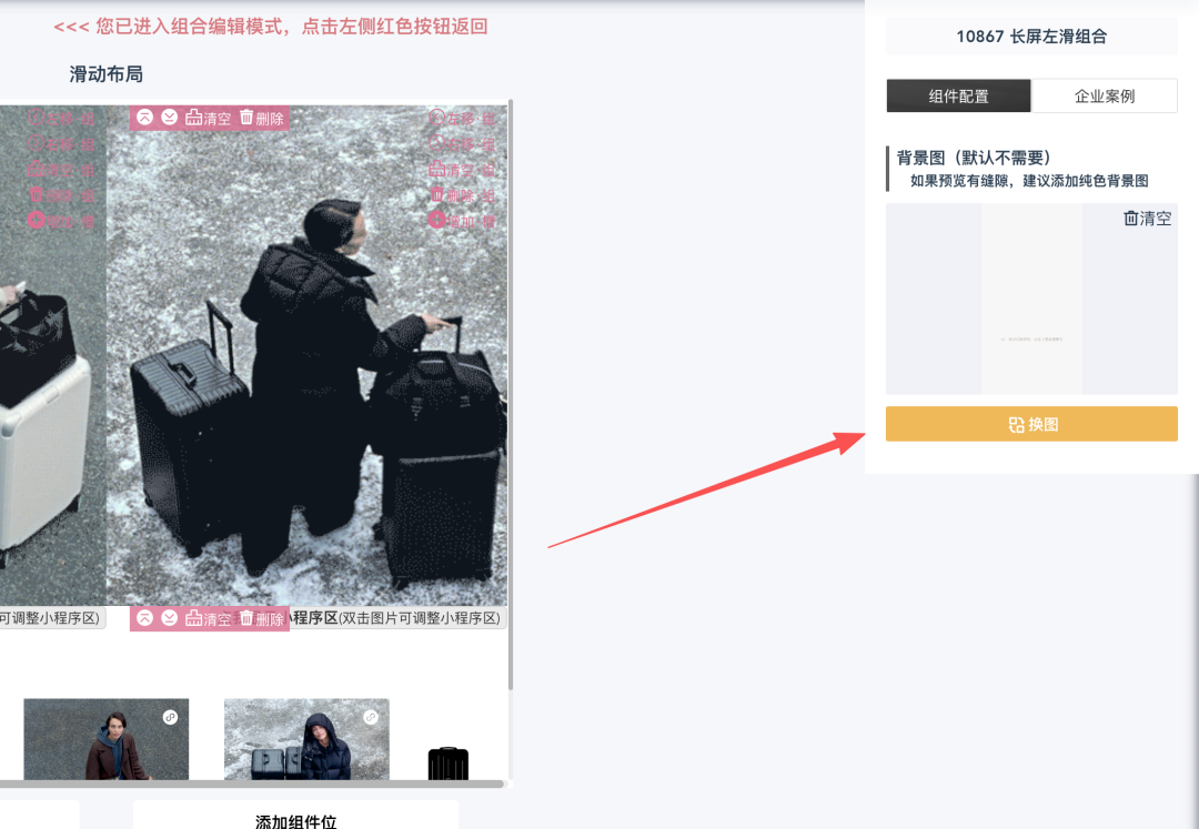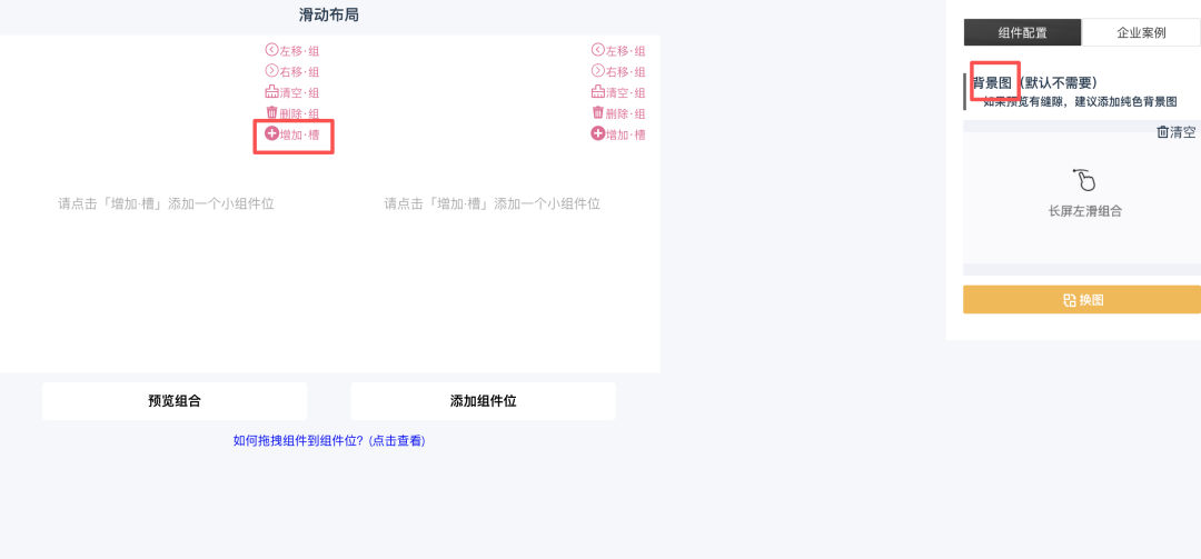 在组合编辑模式中,默认放置了两屏滑动,每一屏滑动点击「增加·槽」可增加一个组件位。右侧根据需要还可选择上传背景图。