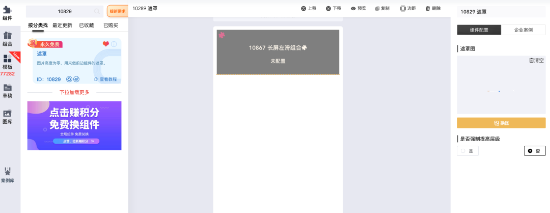 接着在左侧组件中找到「遮罩」组件,点击选择,然后上传一张带有视频号标识的滑动前景图,尺寸为一屏滑动图片的尺寸之和。
