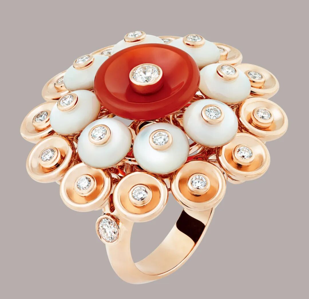 这种对“优雅”与“动感”的极致表达,在梵克雅宝的Bouton d'or系列中达到高潮。该系列从高级定制时装中汲取灵感,起伏有致的金属饰片仿若高定华服上的灵动珠片。玫瑰金、红玉髓、白色珍珠母贝与钻石在其间和谐共舞,密镶技术营造出流光溢彩、浮雕般的生动效果。佩戴时,它随身体韵律摇曳生姿,宛如一场光与色的绚丽舞蹈,将女性的柔美、节日的欢愉与极致的浪漫主义悉数展现,证明了红色不仅是色彩的表述,更是情感与动态的艺术表达。