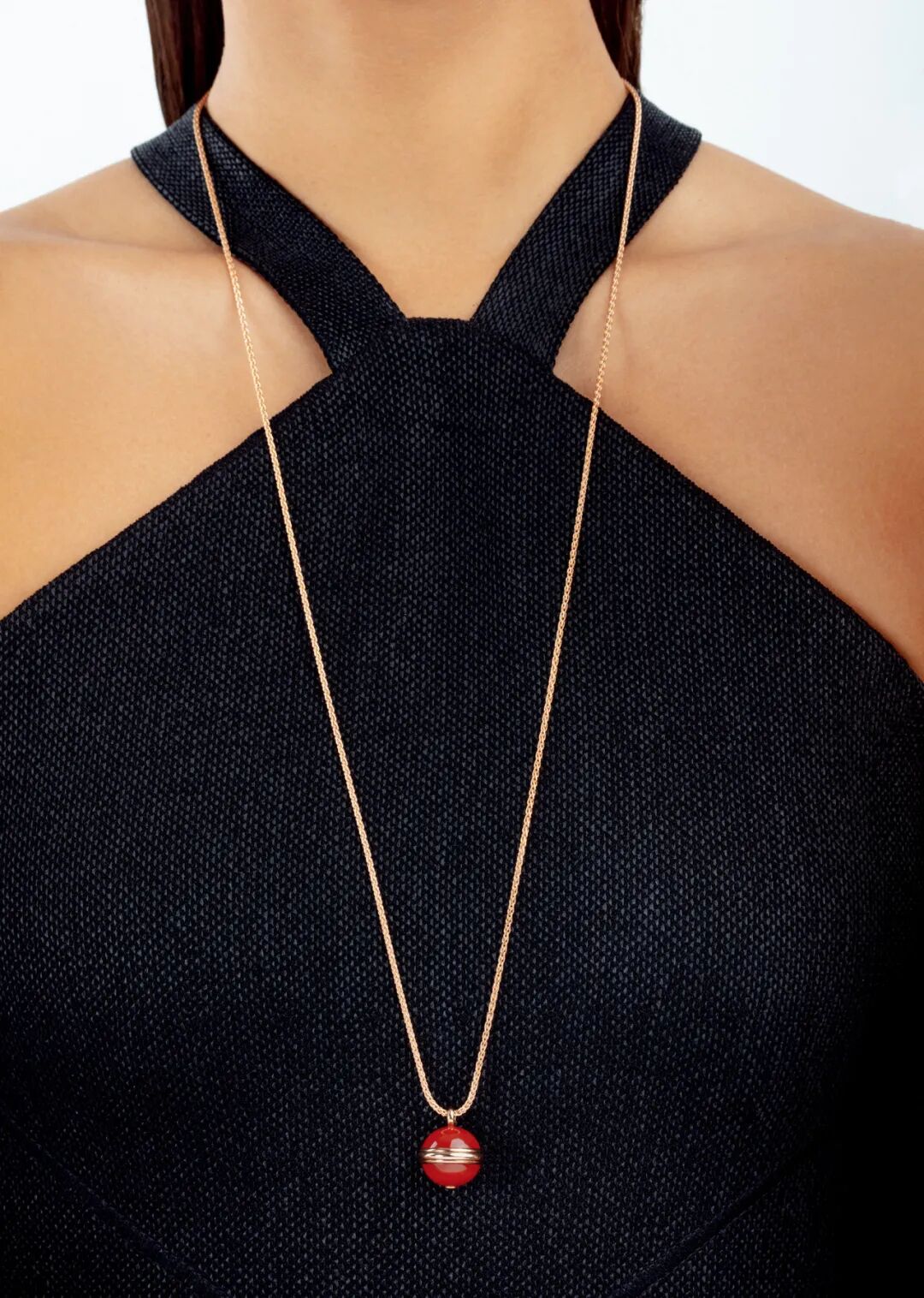 在经典华贵的谱系中,伯爵Possession时来运转系列堪称“玩转好运”的典范。该系列巧妙运用红玉髓圆珠,特别是其耳环作品中18K玫瑰金耳钉由镶钻圆环围绕,垂坠一颗金色运珠与两颗红玉髓圆珠。可转换的佩戴方式充满巧思,“转动”的概念更直接寓意时来运转。这份用设计语言诠释的吉祥寓意,让悦目的红色不仅点缀容颜,更成为承载乐观心态的趣味载体。