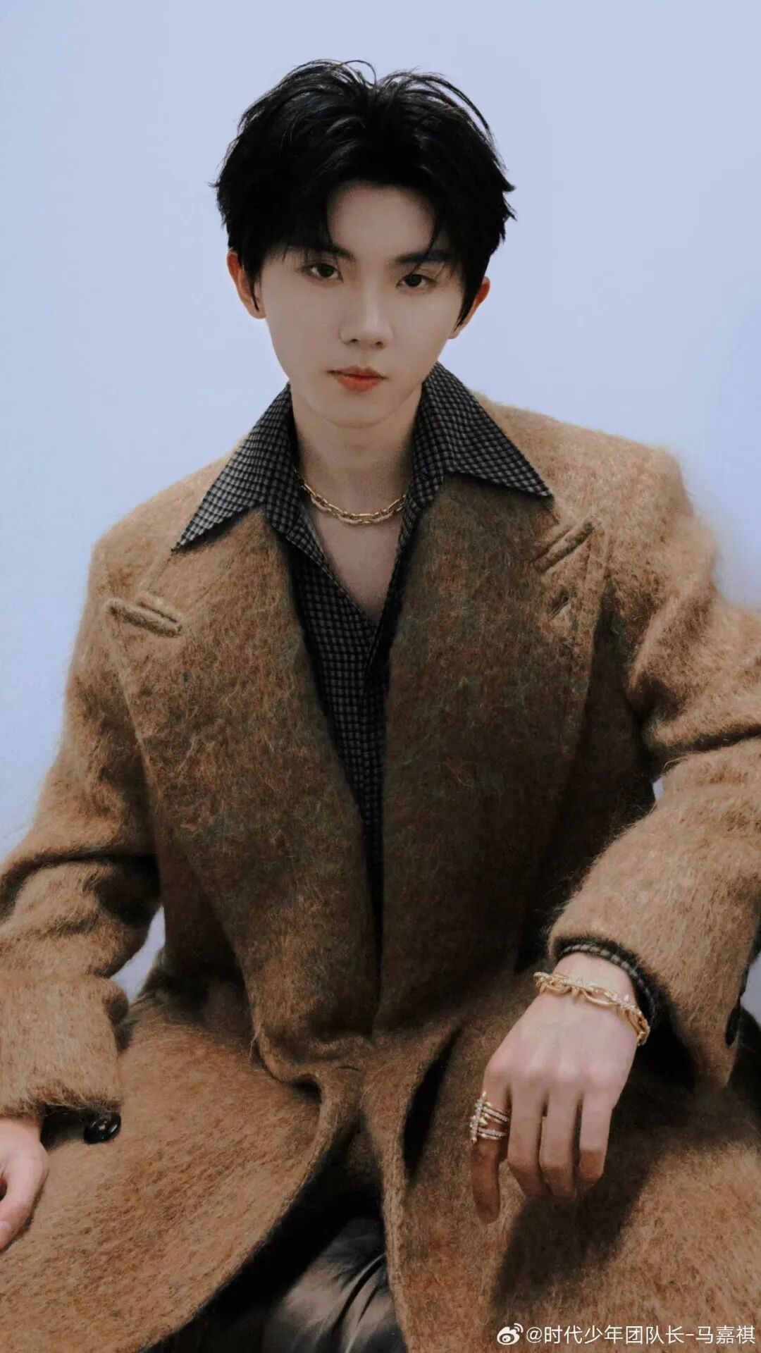 马嘉祺这身 Emporio Armani 2025 秋冬系列的马海毛拉毛长大衣就以突出的质感取胜,用 Tiffany&Co. 链环首饰点缀,与造型呼应,增添精致感。
