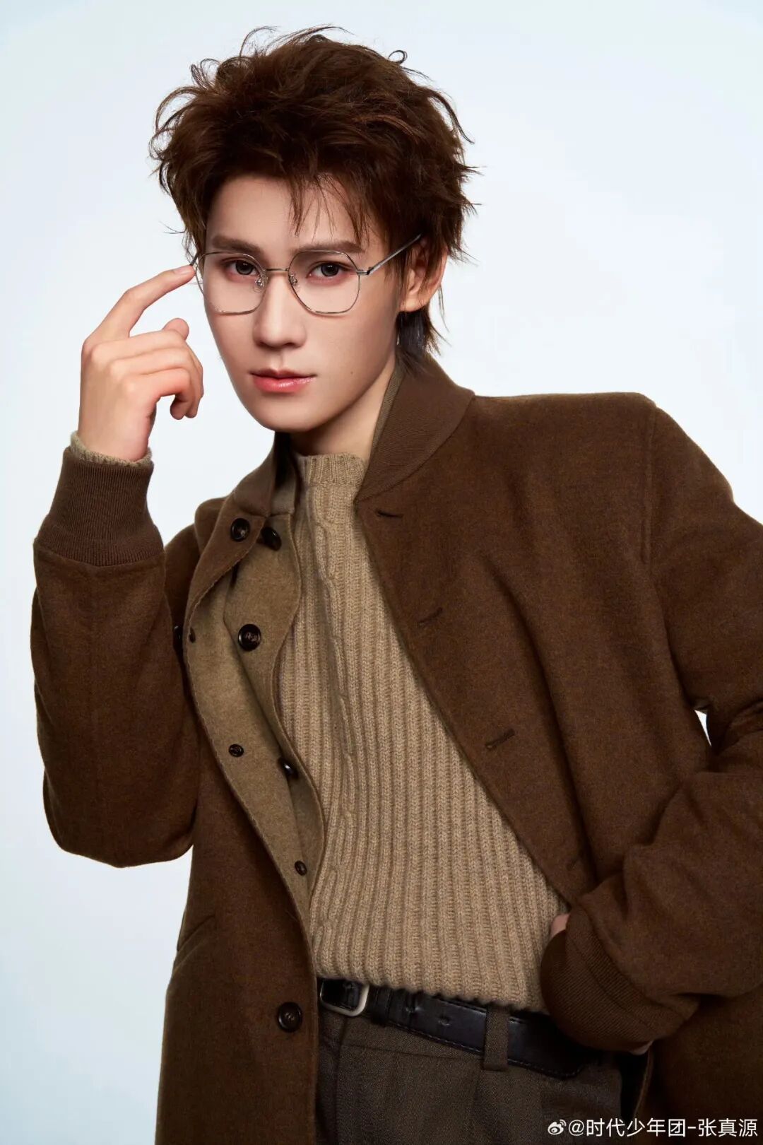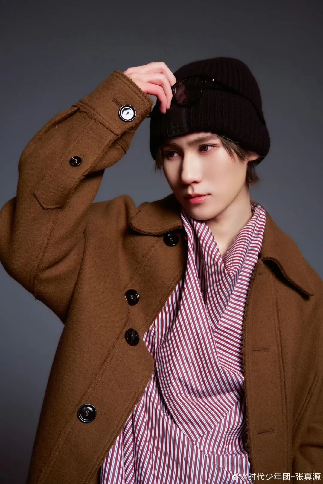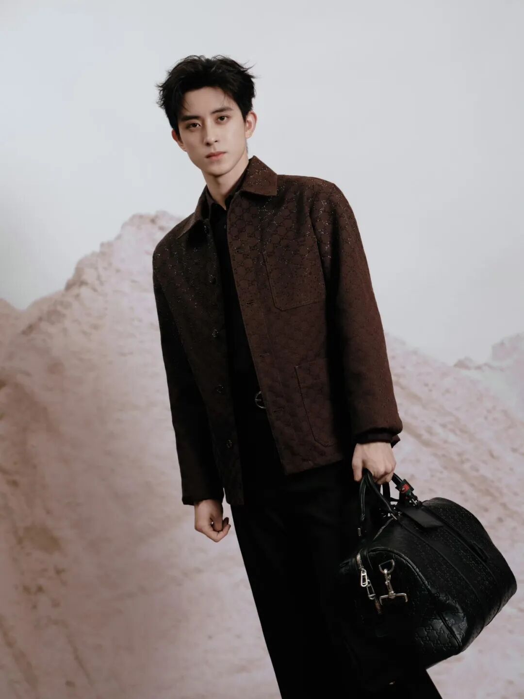 在颜色搭配这块儿,可以大胆学习张真源,一整套来自 Loro Piana 的粉棕色条纹衬衫撞色棕色外套,给人眼前一亮的惊喜感,也为冬日注入一丝活力气氛。