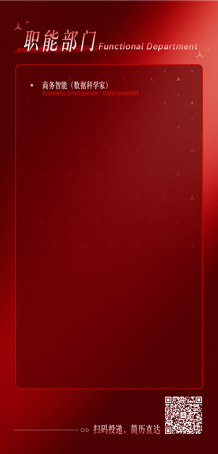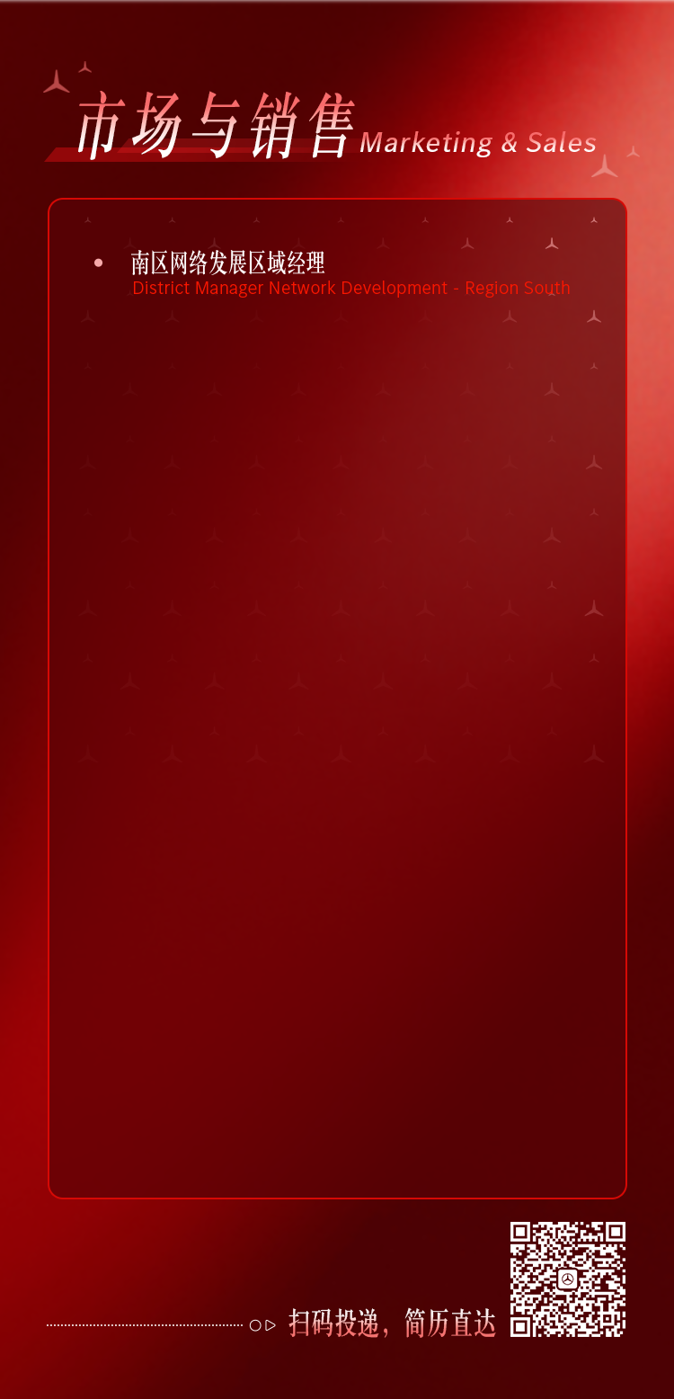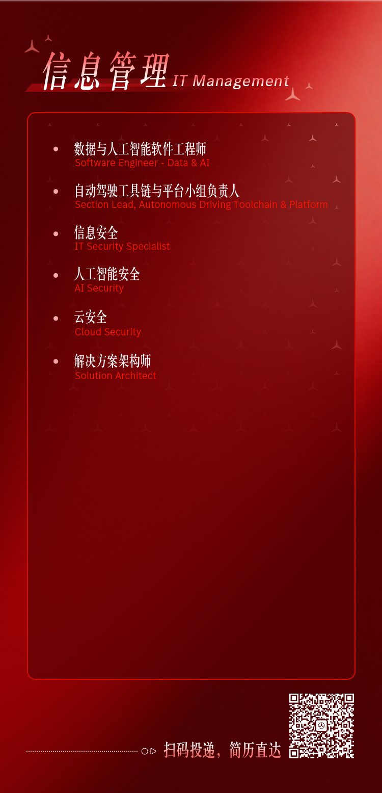 文章内容来源于公众号:梅赛德斯-奔驰招聘,点此可查看原文,内容版权归相关企业所有,本网站仅供交流学习。若涉及版权问题或存在侵权情况,请及时与我们联系,我们将第一时间进行删除处理。
