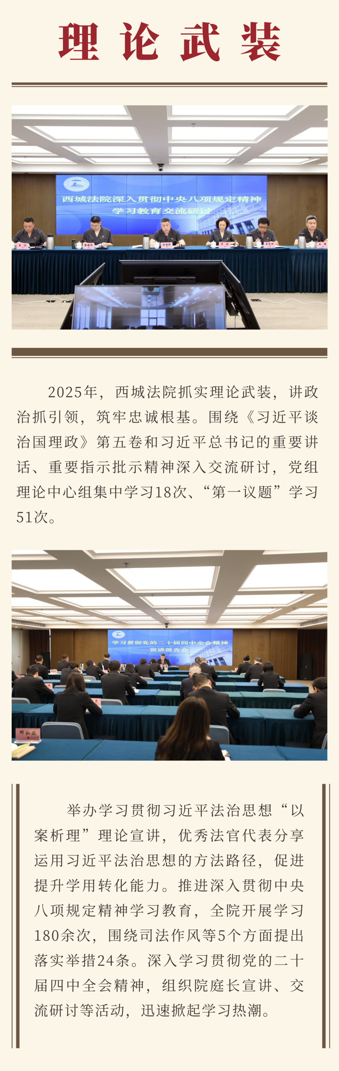 2025年,北京西城法院坚持以习近平新时代中国特色社会主义思想为指导,全面贯彻党的二十大和二十届历次全会精神,初心如磐、步履铿锵,以初心映照司法为民的温度,以恒心筑牢公平正义的精度,以匠心书写服务大局的深度,以决心彰显强基固本的力度。