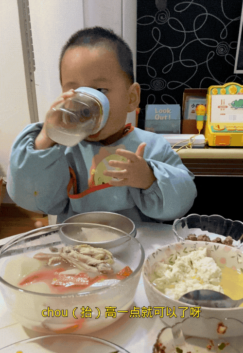享受举起水杯自主喝水的乐趣