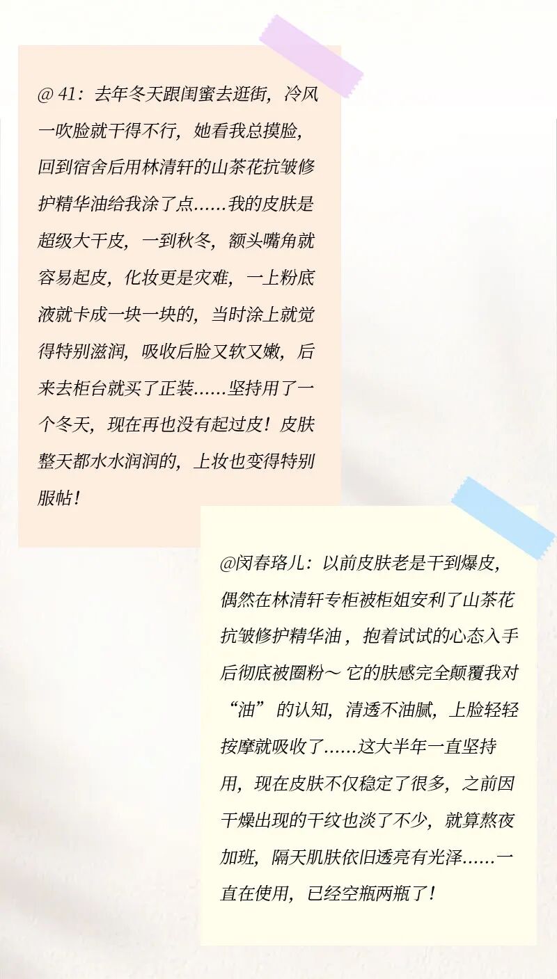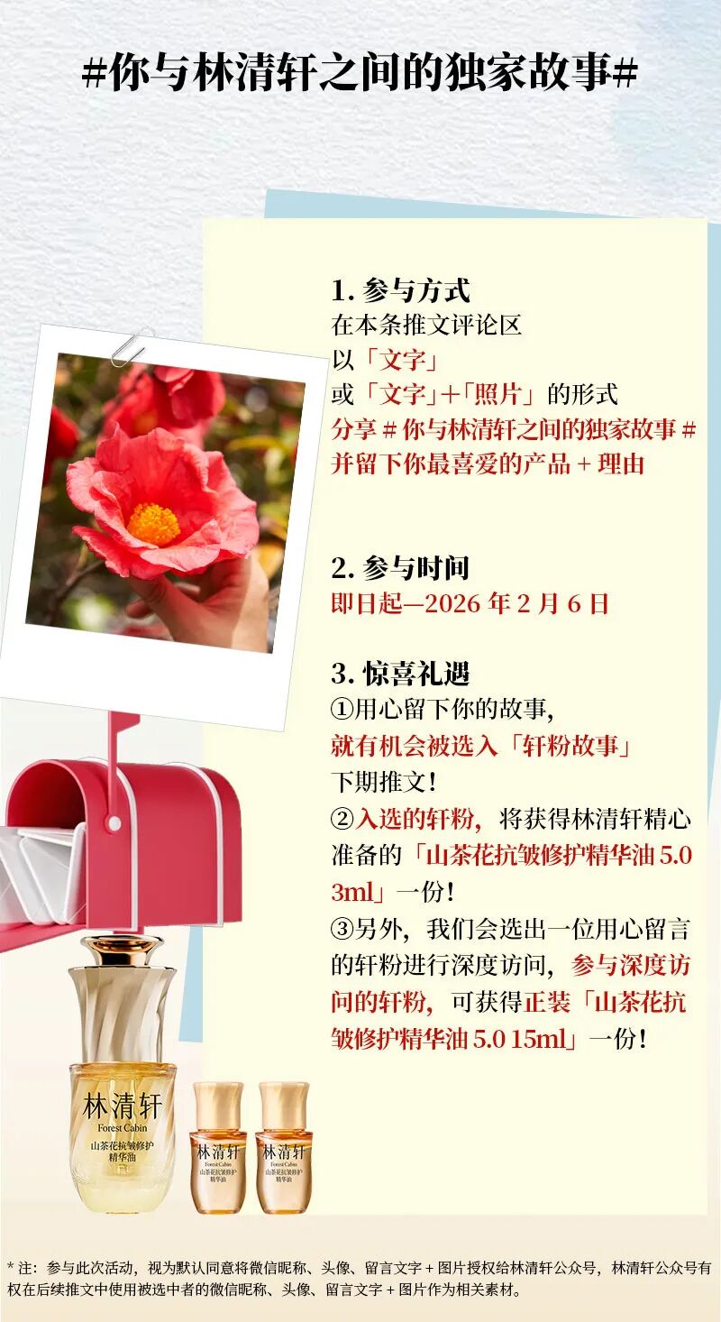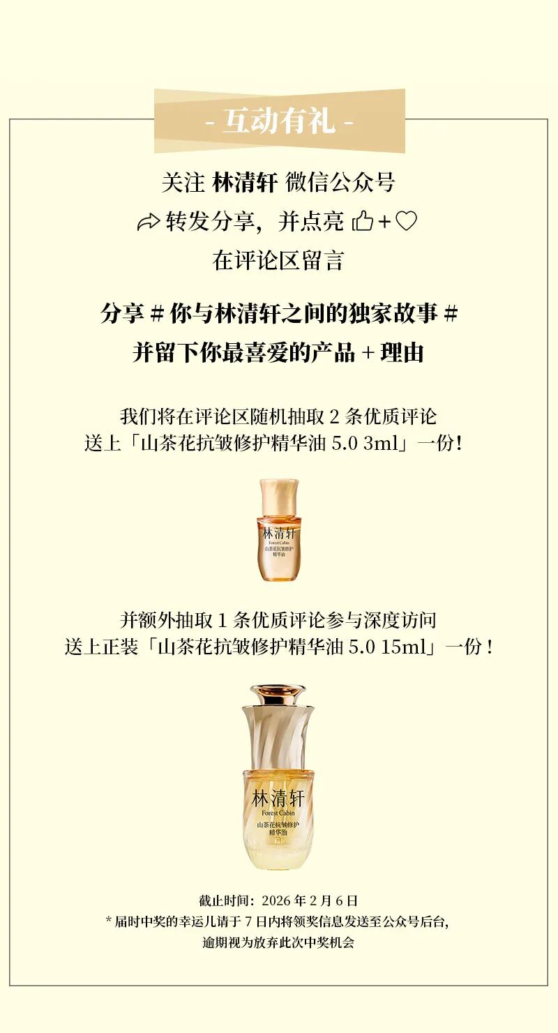 摘要:林清轩用户故事第六期 | 留下你与林清轩的专属故事,免费抽——山茶花抗皱修护精华油!