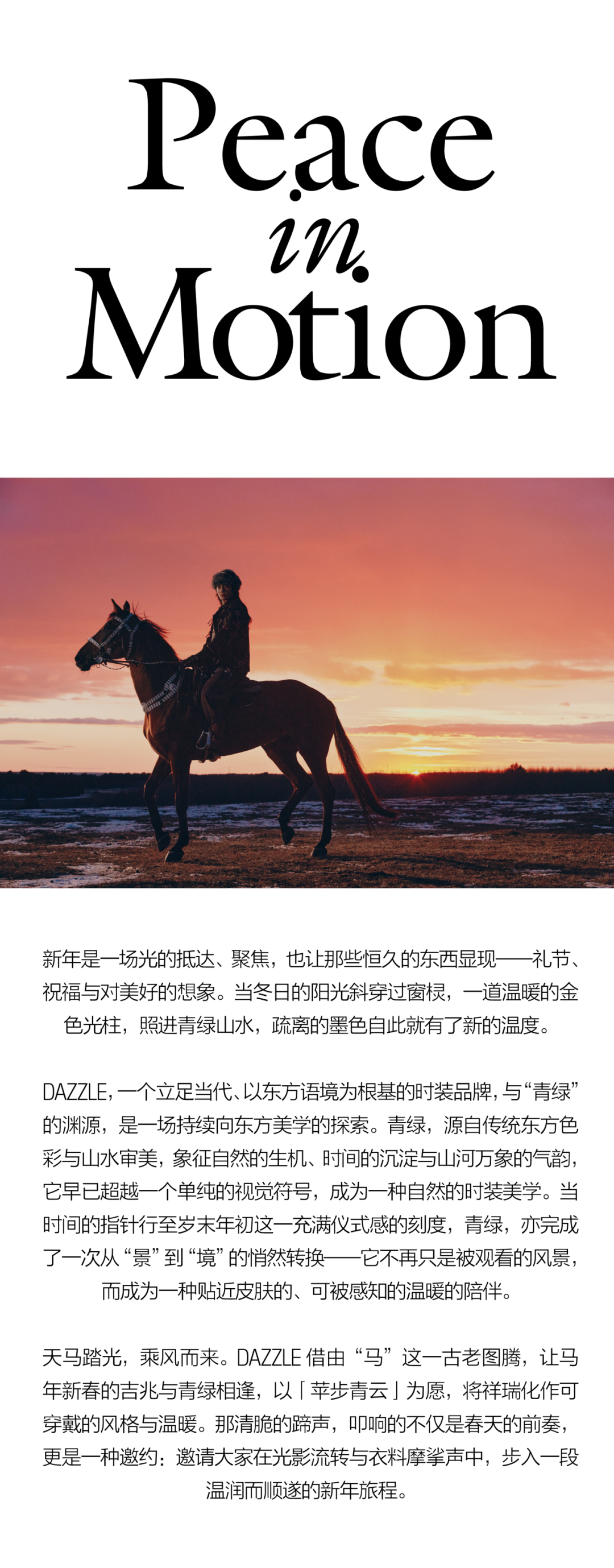 马,是刻在中国人文化基因里的浪漫符号,是力与美的流动诗篇。它代表着“骁腾有如此,万里可横行”的无羁自由,也沉淀着“春风得意马蹄疾,一日看尽长安花”的盛世想象。在DAZZLE 2026马年新春青绿系列中,“马”的意象被再度唤醒,并被赋予一层晨光般的当代注解——褪去历史的尘沙,成为衔引春光、温暖人间的信使。奔腾的不是速度,⽽是温度。