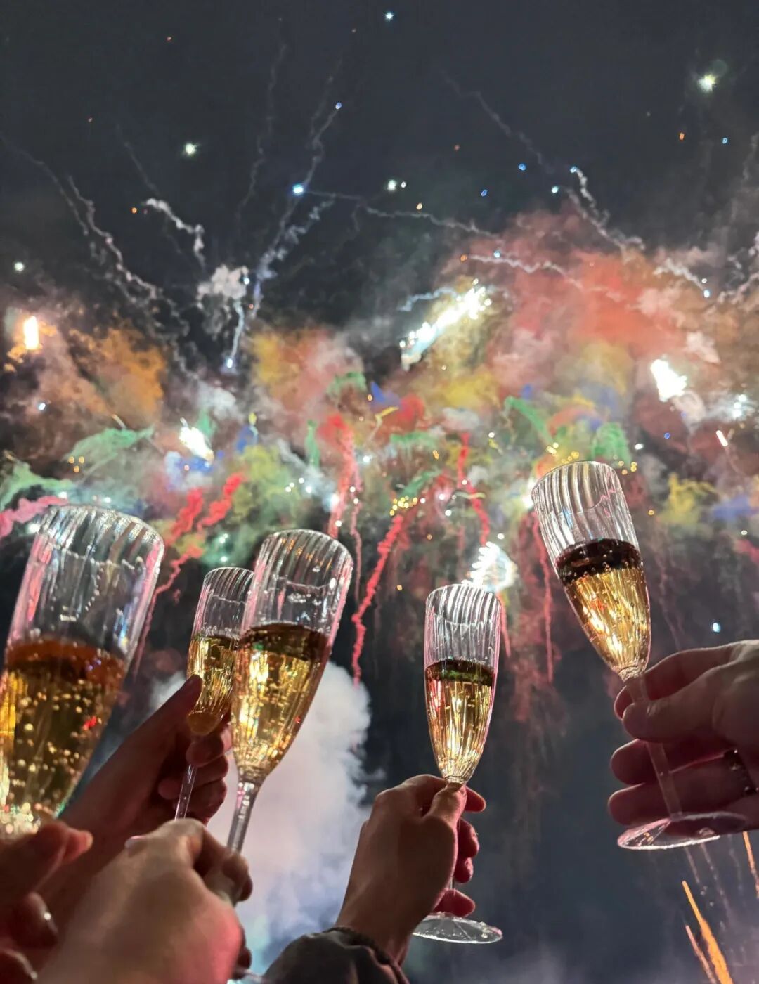 和好友聚会时,大胆尝试搞怪又鲜活的互动姿势:一人拿着红色酒瓶凑近嘴边做出要喝的动作,另一人高举酒杯欢呼,脸上露出夸张又开心的表情。随意的肢体动作搭配自然的笑容,能捕捉到新年聚会里最真实的快乐瞬间,让照片充满热闹的节日烟火气。