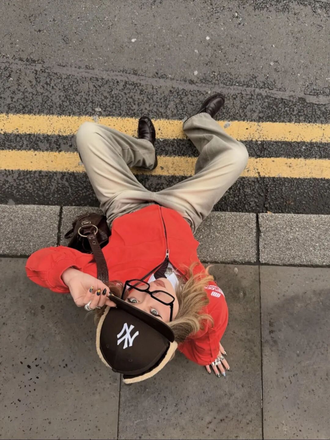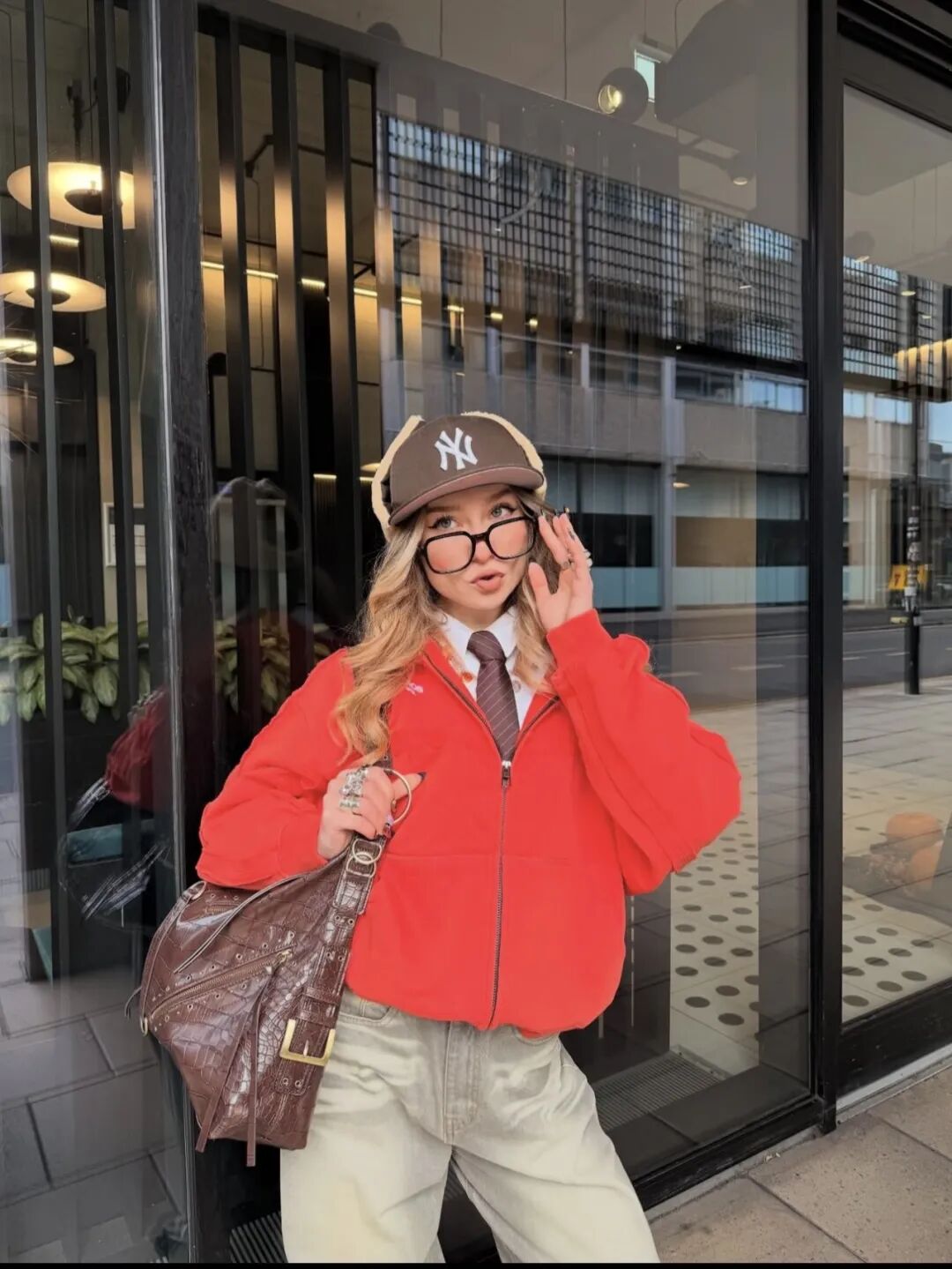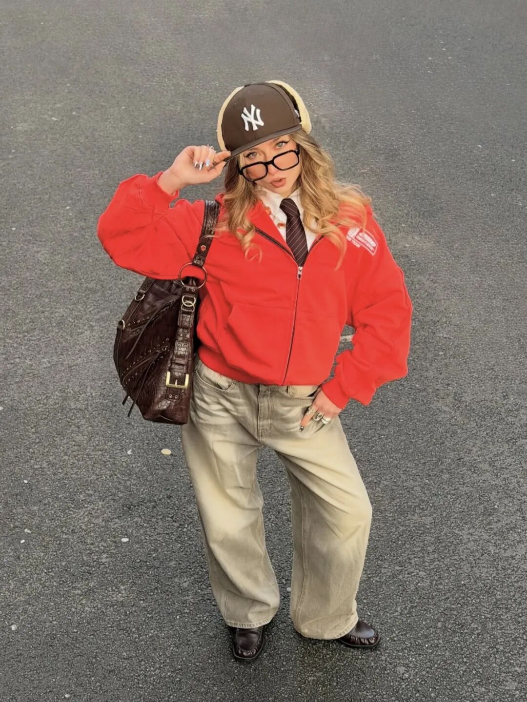 亮红色短款拉链卫衣作为视觉核心,自带节日的鲜活感,内搭白衬衫+深色条纹领带,瞬间解锁学院风与运动风的混搭巧思。下装搭配浅卡其色做旧阔腿裤,宽松版型弱化了红色的张扬,更添随性慵懒。配饰上用棕色NY棒球帽、复古棕色腋下包和黑色乐福鞋呼应,美式复古味儿直接拉满,走在街头就是自带镜头感的潮人。