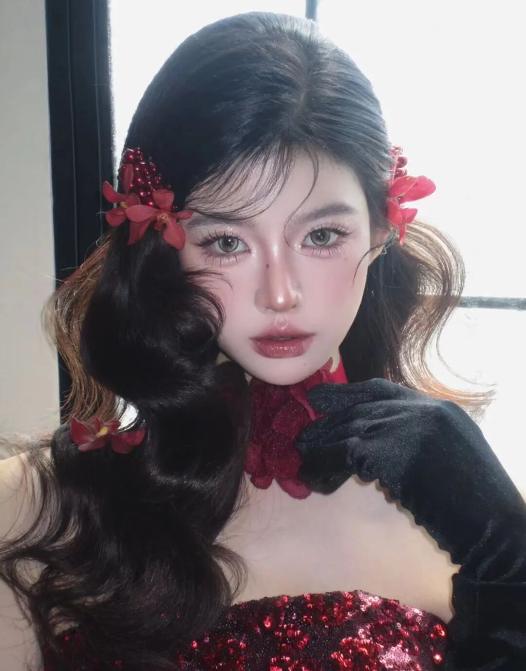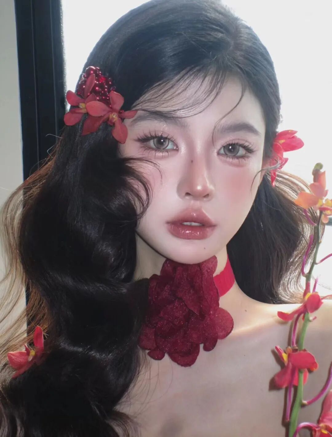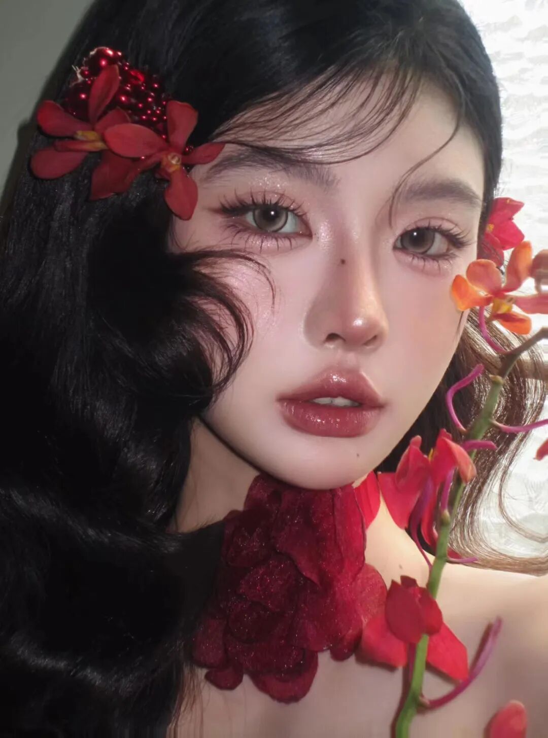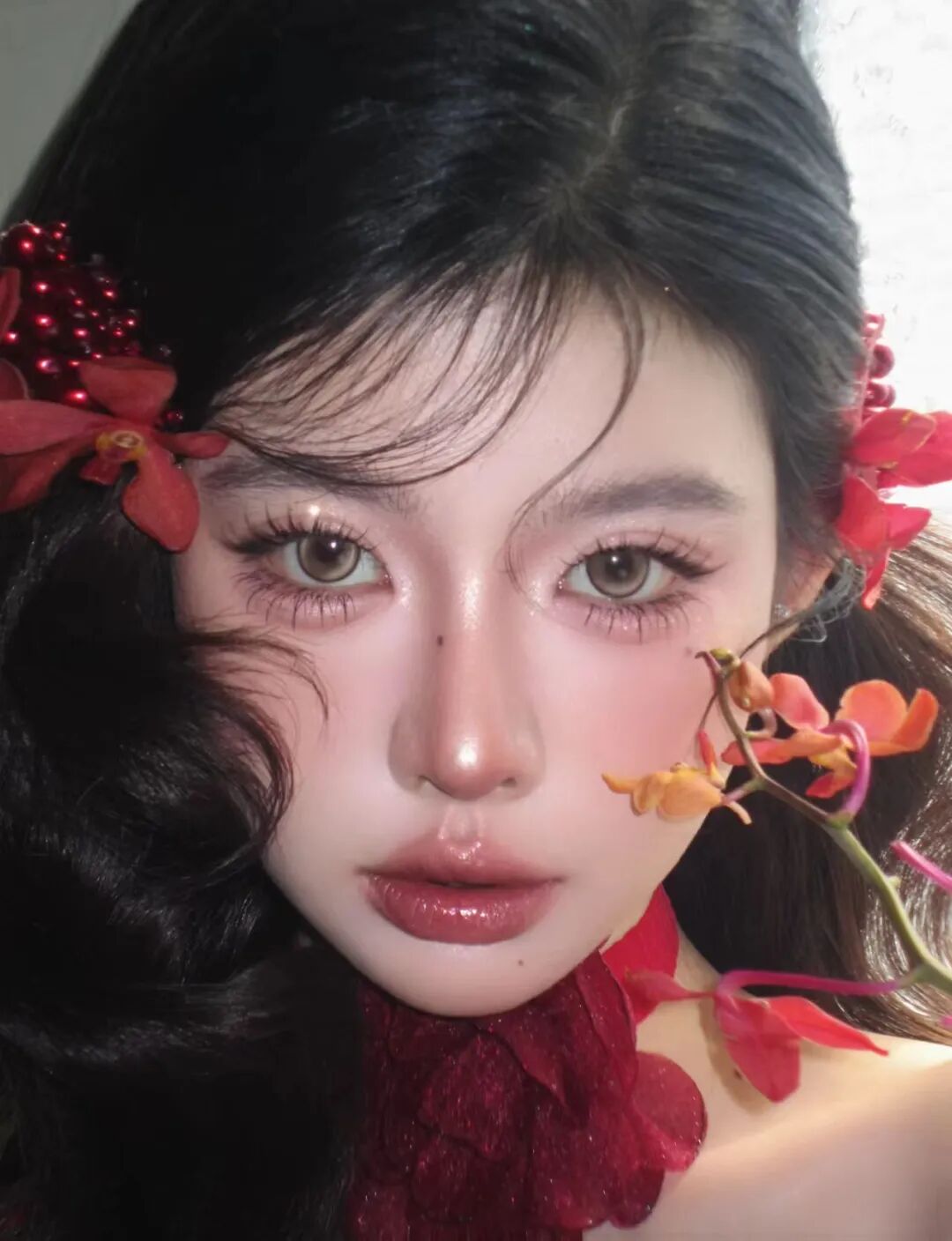底妆打造柔雾水光双效质感,在T区和苹果肌叠加清透高光,让肌肤呈现出通透的微闪效果。眼妆用粉棕色细闪眼影铺满眼窝,眼尾轻扫酒红色加深,搭配仙子毛睫毛让眼睛更灵动,眼下点涂细闪珠光营造泪光感。腮红选蜜桃红调,低饱和晕染在苹果肌,唇妆搭配红棕调镜面唇釉,打造丰唇效果。再用红色兰花发饰点缀发丝,搭配红色纱质颈饰,中式浪漫与新年红韵交织,搭配红丝绒裙装或复古吊带都超惊艳。