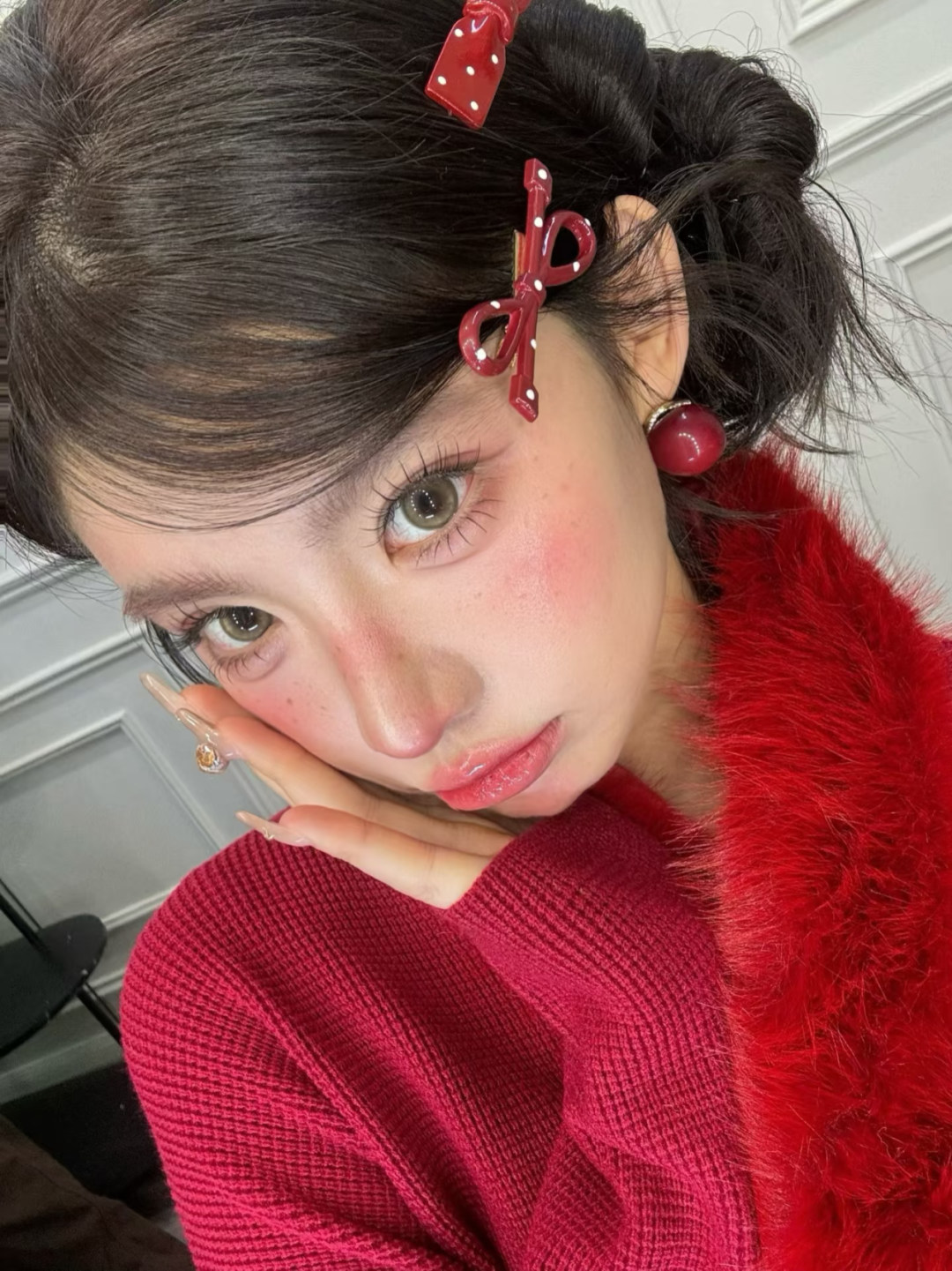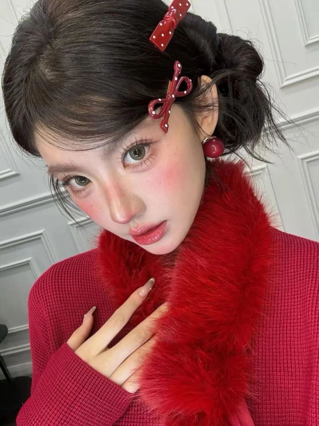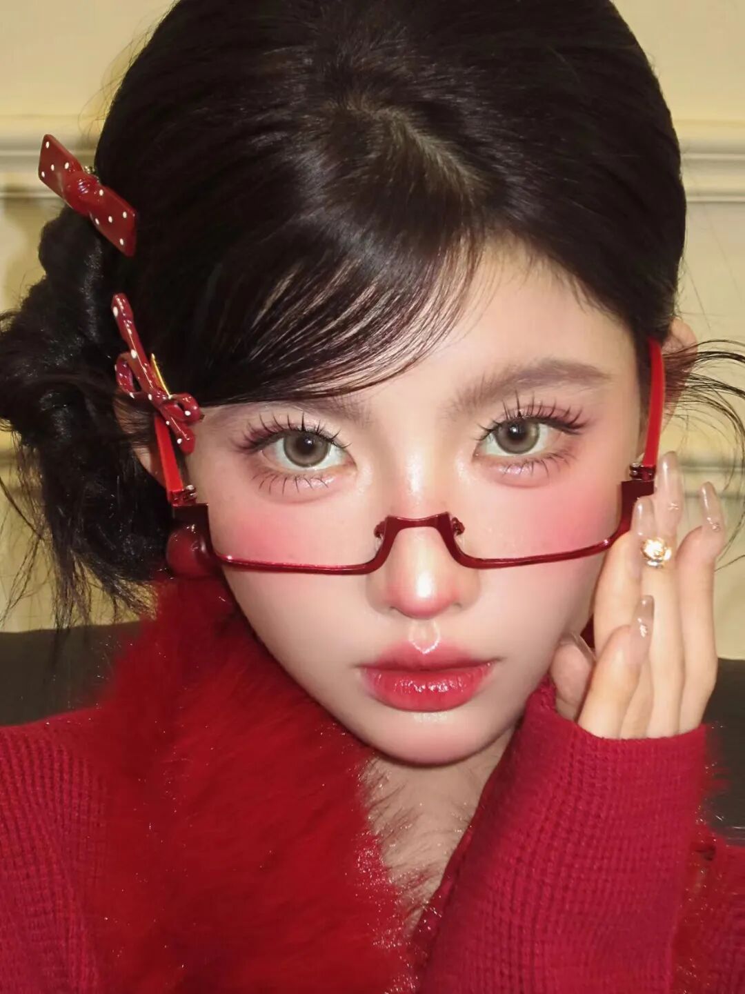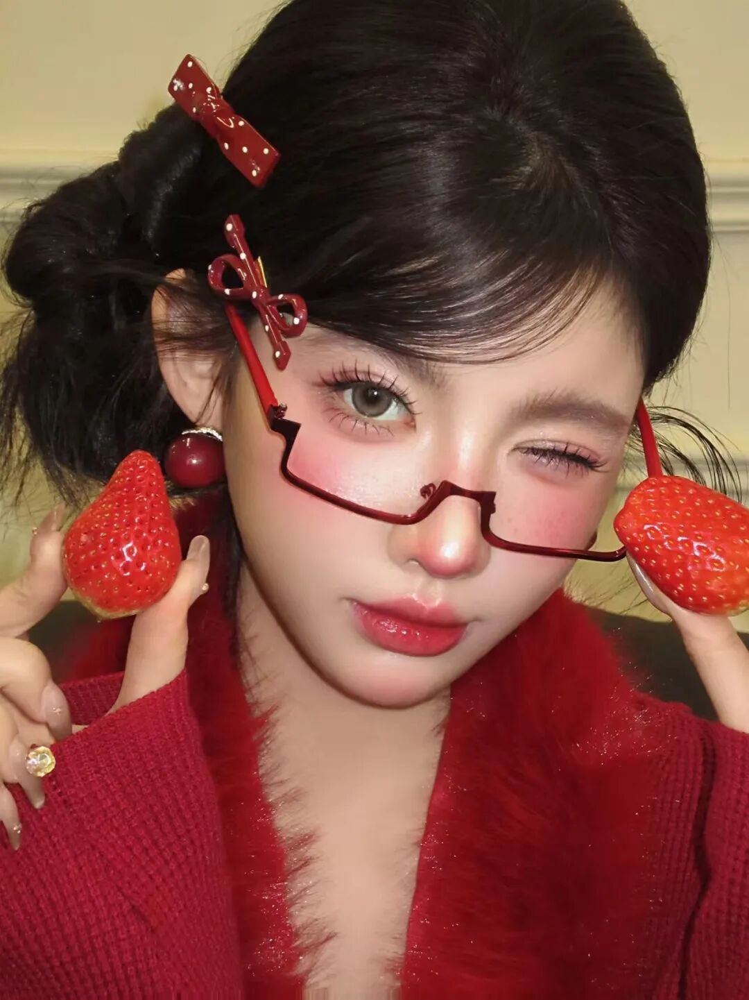 底妆打造白皙透亮的妆效,在眼下和鼻梁处轻扫腮红,营造出微醺的氛围感。眼妆以粉色调眼影为主,搭配纤长的睫毛,让眼睛看起来灵动又无辜。腮红选玫红色,大面积扫在苹果肌上,和红色穿搭相呼应,唇妆用红调镜面唇釉,打造饱满的唇形。再搭配红色发饰和耳饰,甜妹感扑面而来。