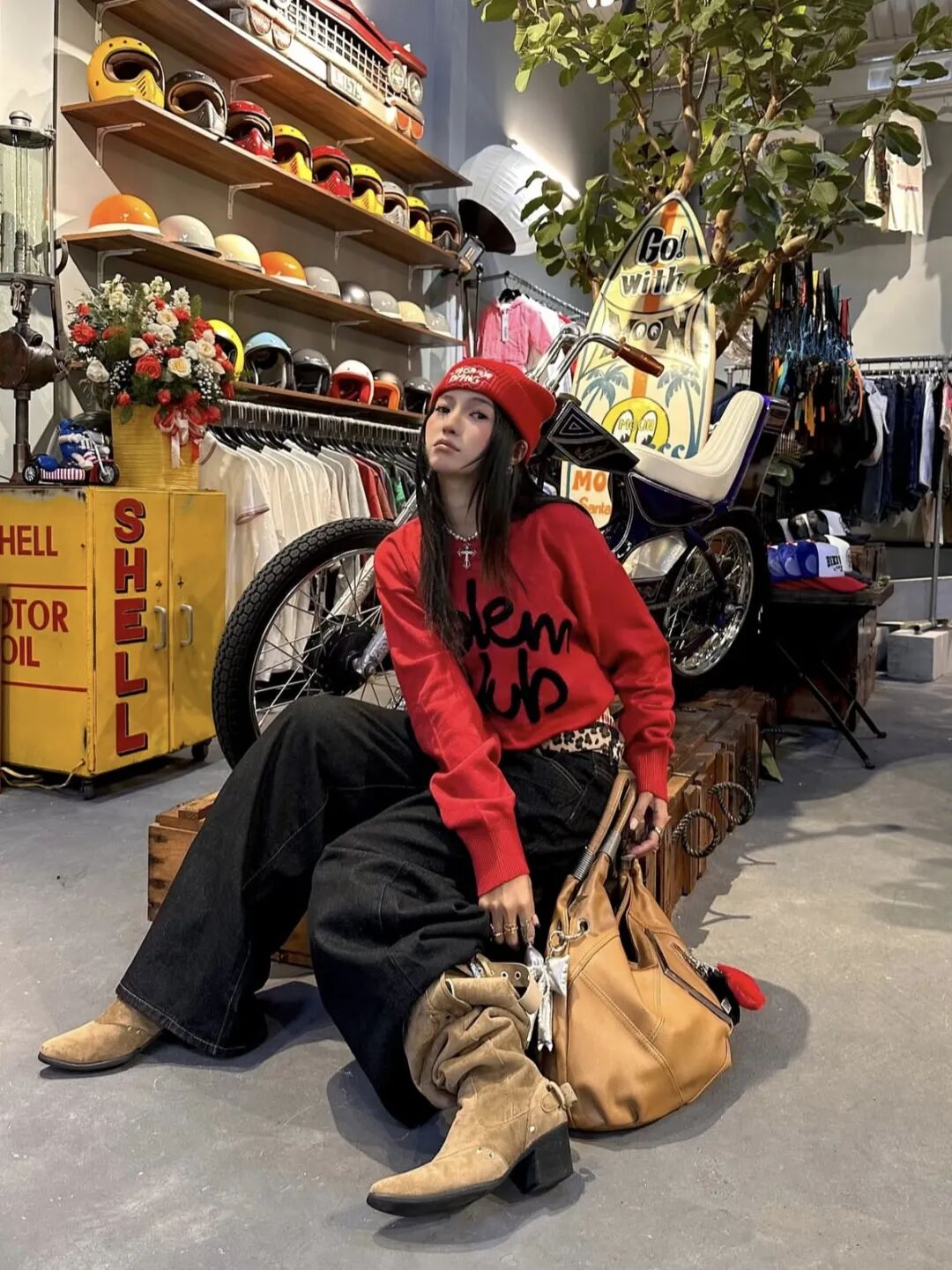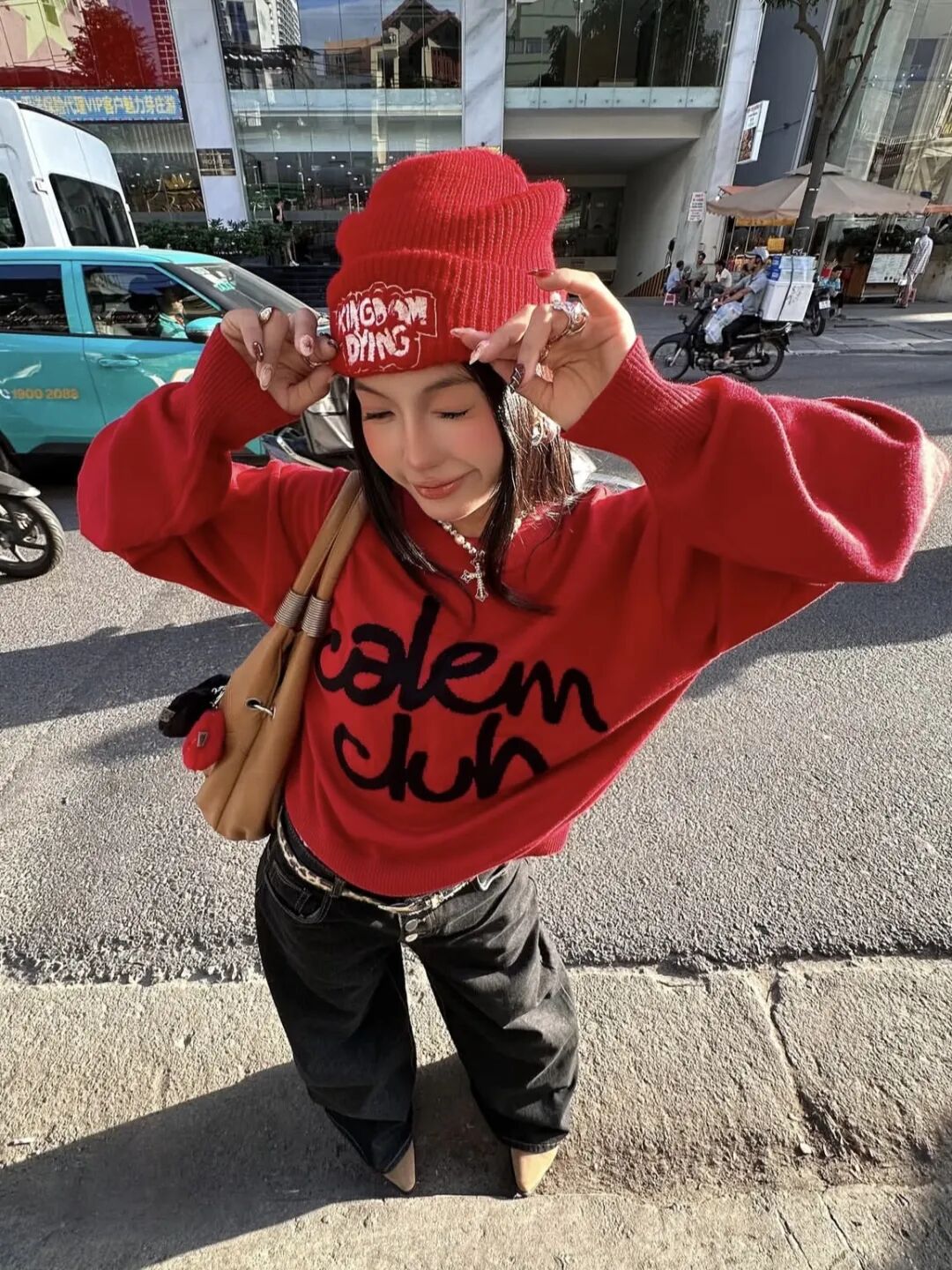 正红色字母针织毛衣是冬日跨年的吸睛利器,黑红撞色的字母印花打破纯色单调,街头潮酷感拉满。搭配黑色阔腿弯刀牛仔裤,宽松裤型修饰腿型的同时,和红色上衣形成经典撞色,利落又大气。红色针织冷帽与上衣同色呼应,再踩一双卡其色堆堆靴,韩系爱豆同款的跨年造型轻松拿捏,不管是去咖啡店打卡还是参加livehouse都超合适呀~