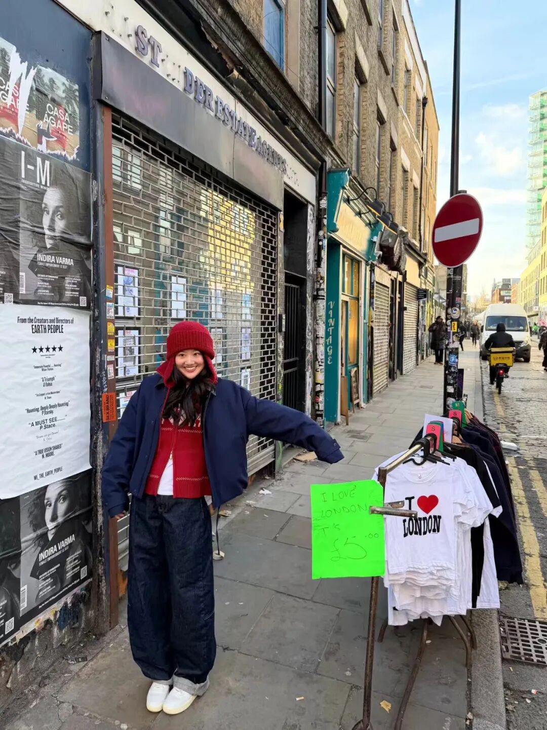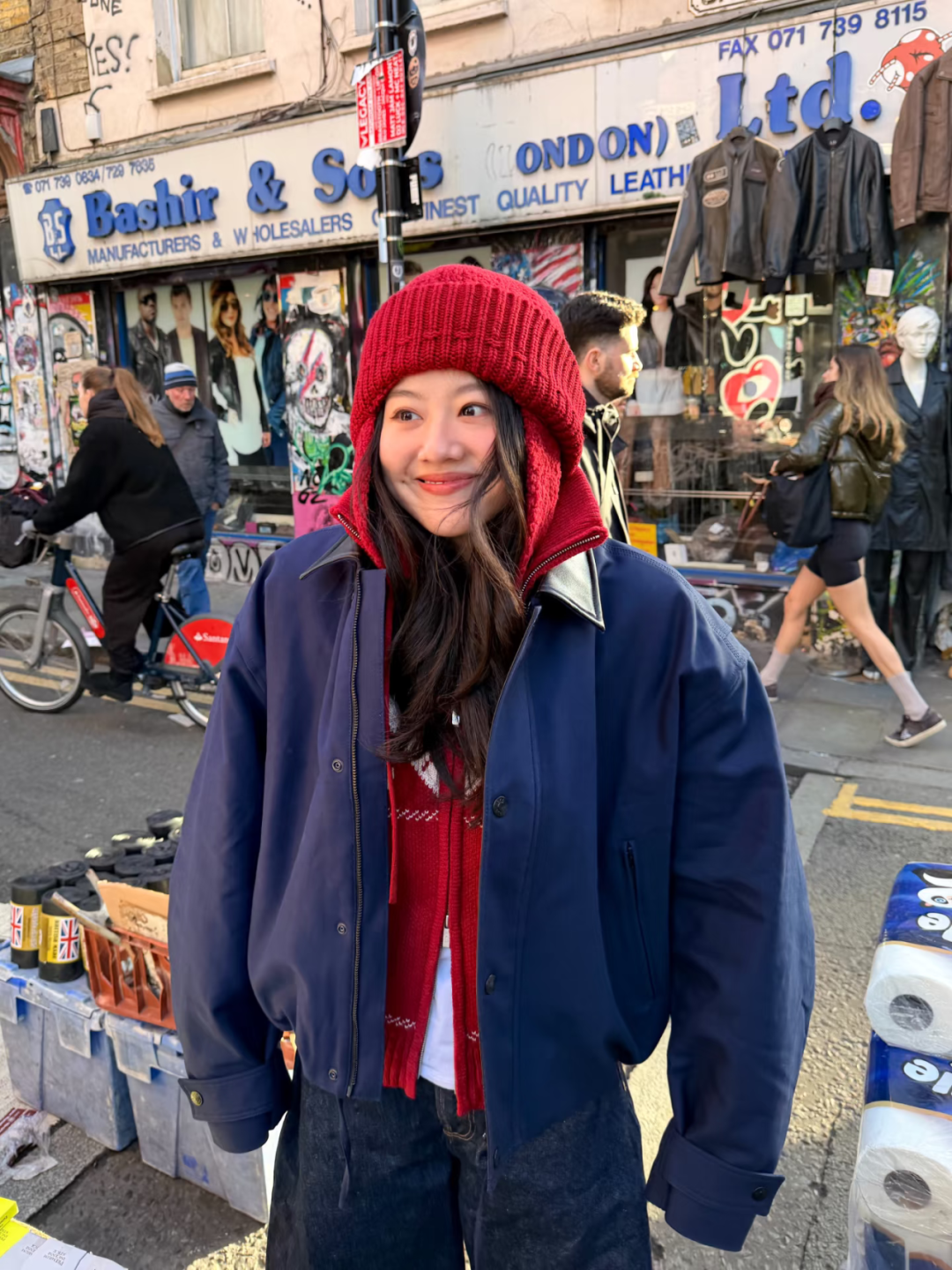 走温柔复古路线的话,这组红黑蓝叠穿值得参考。酒红色菱格针织马甲内搭白T恤,外层叠穿藏蓝色短款夹克,三层叠穿打造出丰富的层次感,红色元素点缀其中,既契合跨年的节日氛围,又不会过分抢眼。下装搭配深色阔腿牛仔裤+白色板鞋,再配上红色针织冷帽,英伦街头的随性与甜美交织,氛围感直接封神。