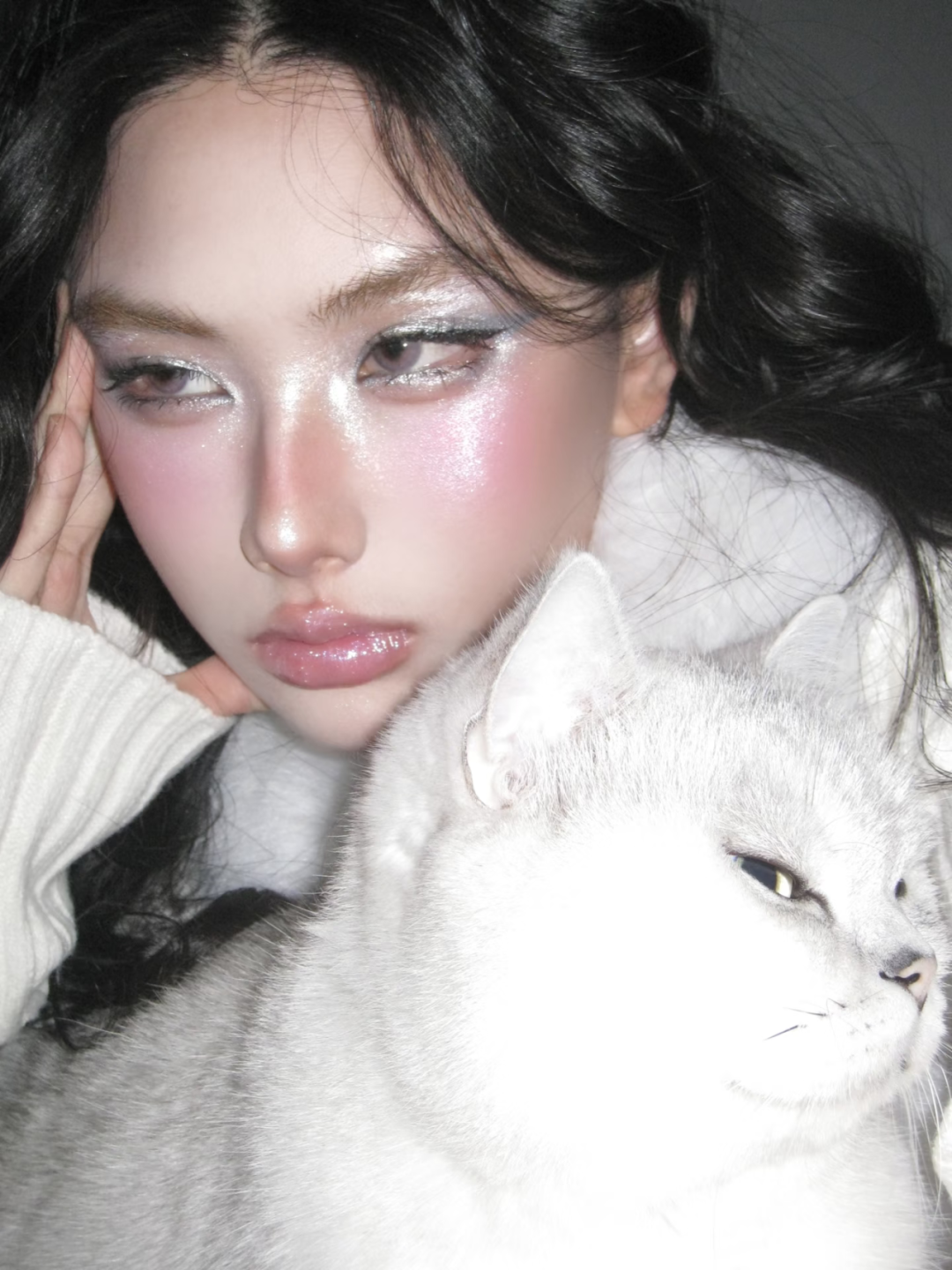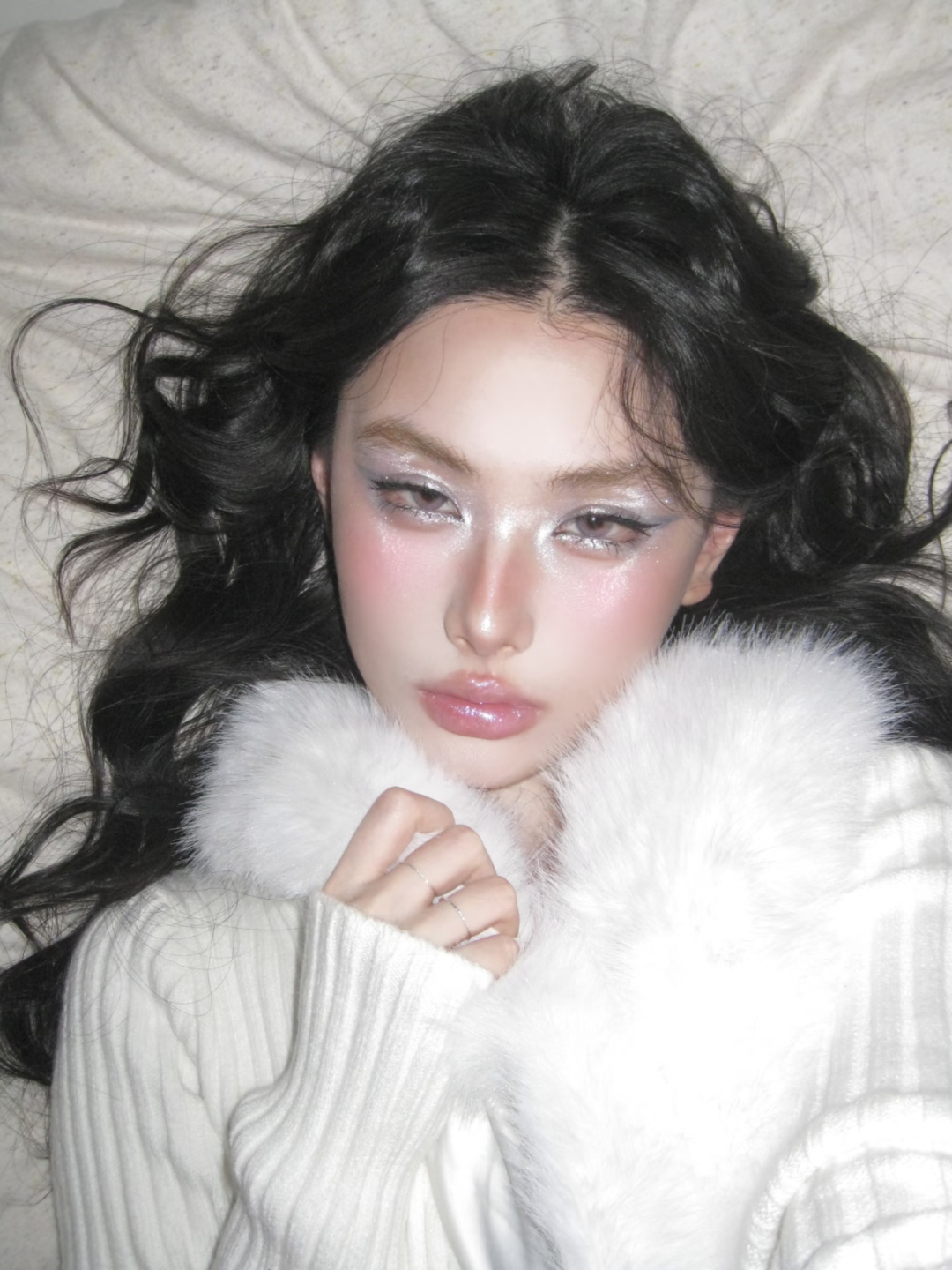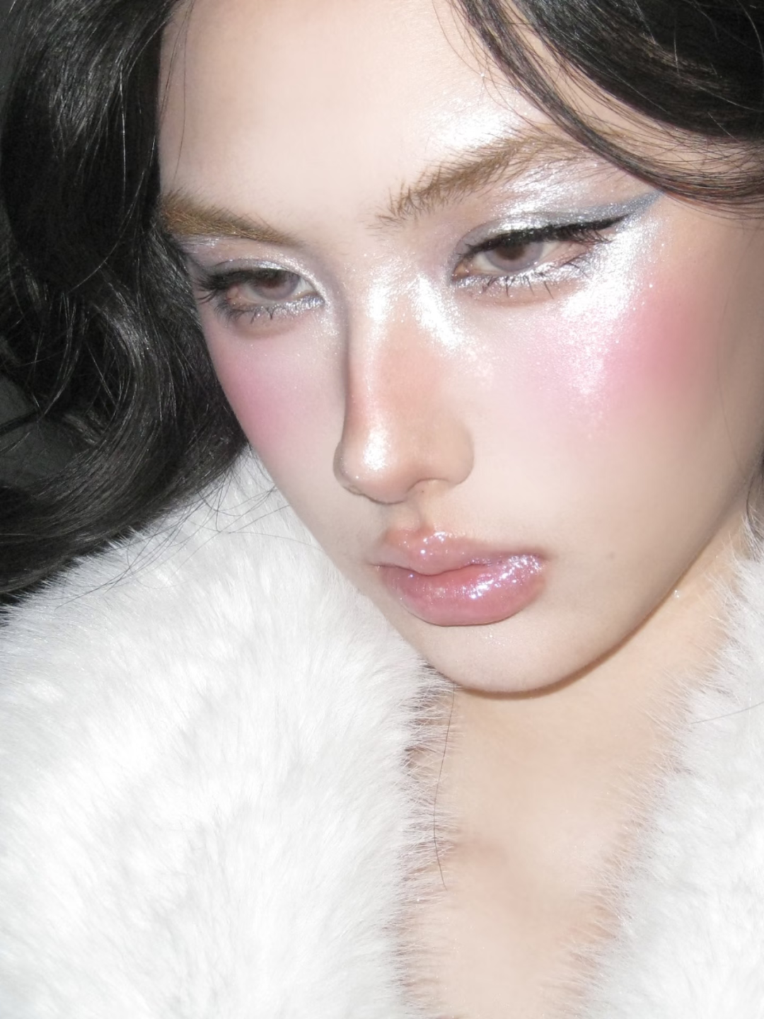 底妆打造清透的水光肌质感,在鼻梁、颧骨、眉骨处叠加高光,让肌肤在灯光下透着细腻光泽。眼妆以银白碎钻眼影为主,沿着眼睫毛根部勾勒细闪眼线,眼头和卧蚕处也点缀碎钻闪片,清冷又华丽。腮红选粉紫色调,大面积扫在苹果肌上并向太阳穴晕染,唇妆搭配镜面水光唇釉,打造饱满嘟嘟唇,冷艳中带着娇柔~