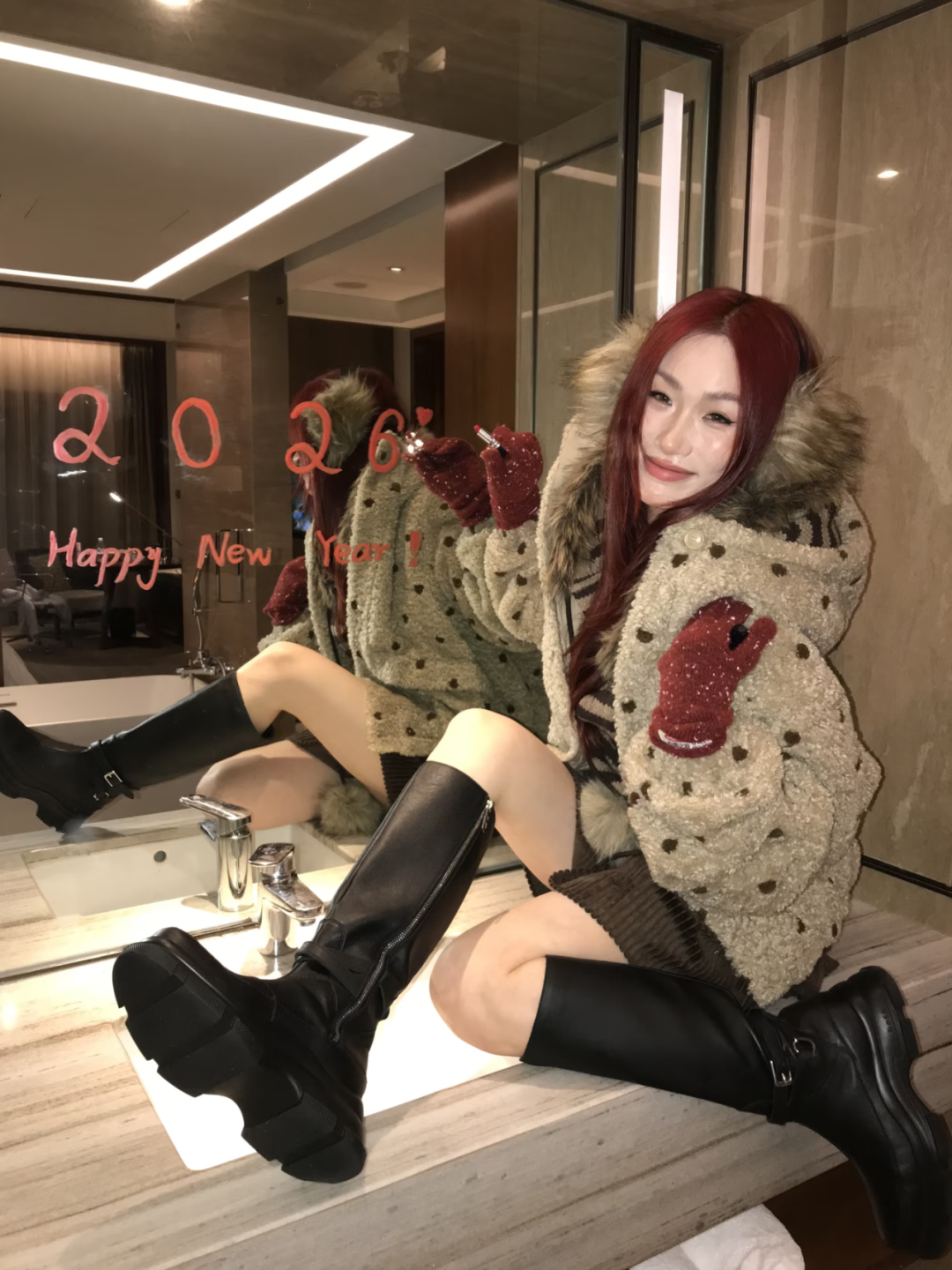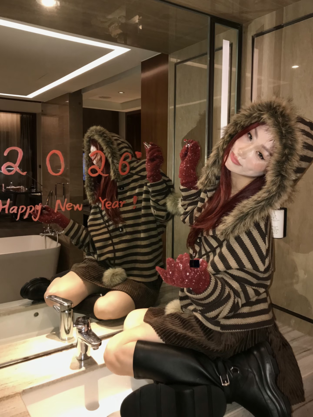 面对室内镜面时,一只手拿着口红在镜面上书写“Happy New Year”等新年字样,另一只手轻握口红管身,身体侧对镜头回头看,利用镜面的反射效果打造互动感与层次感。发丝自然垂落搭配红色礼裙,新年的浪漫与俏皮感直接拉满,拍出来的照片既有创意又具节日氛围。
