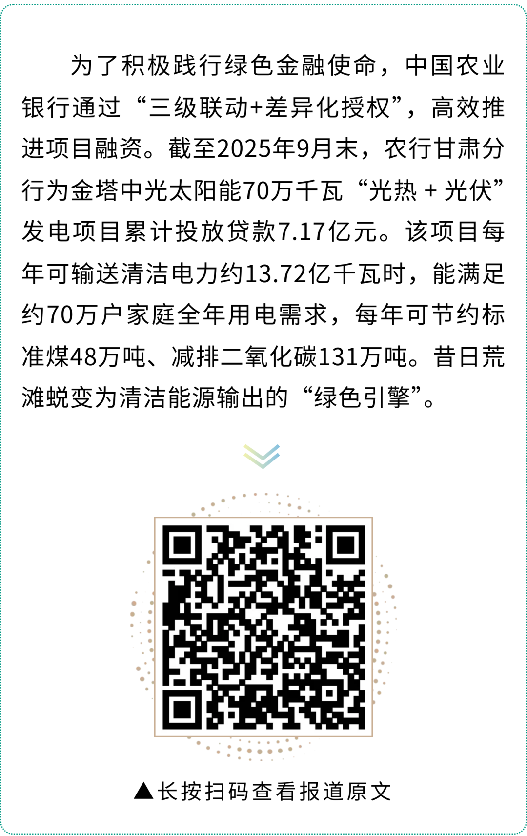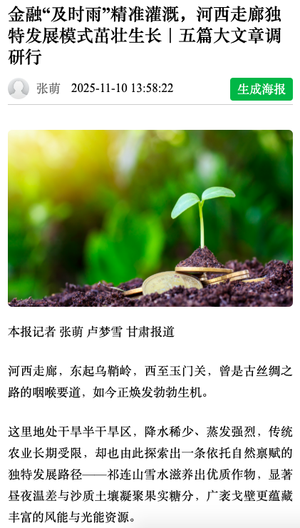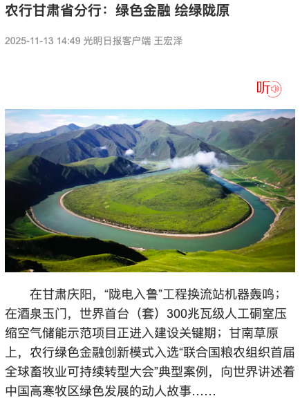 近期,新华社、《光明日报》、《华夏时报》、《21世纪经济报道》、《经济观察报》等多家主流媒体记者,深入甘肃金融服务一线调研,报道农业银行立足地方实际,精准发力支持乡村全面振兴、促进经济社会绿色转型的创新实践与扎实成效。
