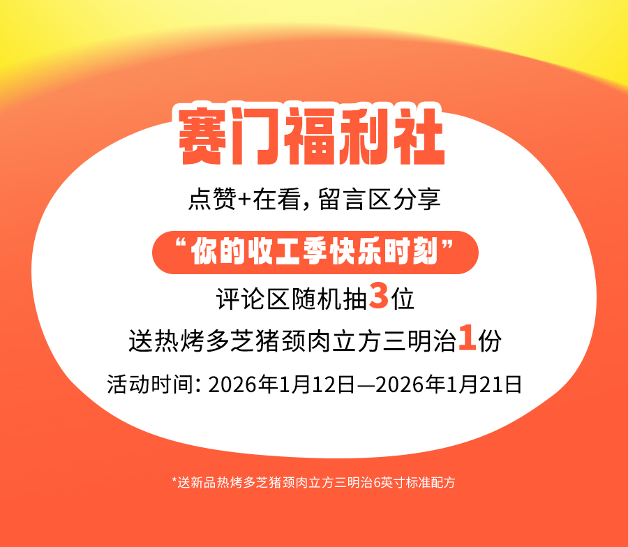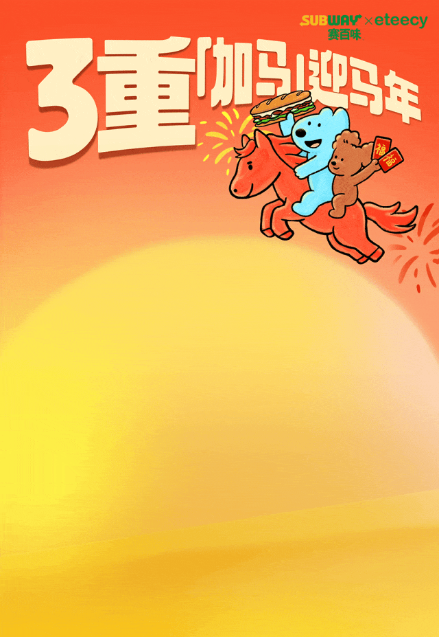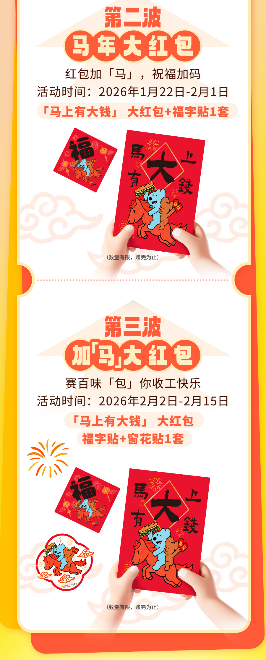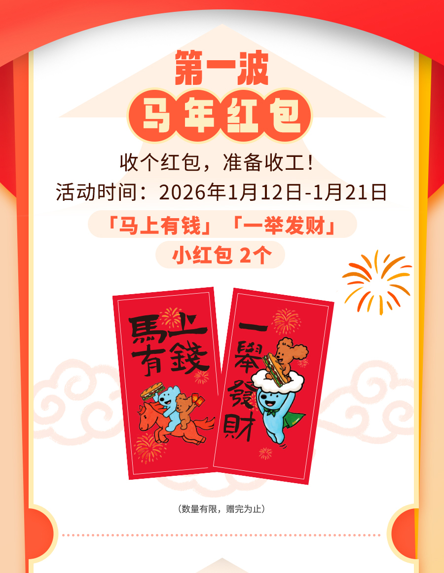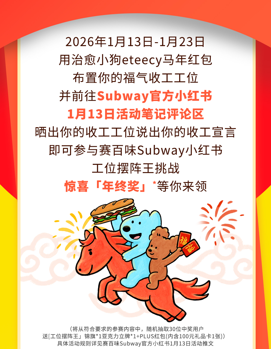 上述周边赠品限2026年1月12日至2026年2月15日于SUBWAY®赛百味中国大陆地区部分餐厅供应,机场、火车站等交通枢纽餐厅、旅游景区餐厅、园区内部餐厅等特殊餐厅除外,具体以餐厅公示为准。产品以实物为准,以上为创意图片,仅供参考。「马年」红包限量70000份(每份含2款样式红包各1个),数量有限,赠完即止;「马年」大红包限量35000套(每套含大红包+福字贴各1个),数量有限,赠完即止;「加马」大红包限量20000套(每套含大红包+福字贴+窗花各1个),数量有限,赠完即止,具体内容以门店实际售卖为准。「马年」红包、「马年」大红包、「加马」大红包均为非卖品,无市场参考价。活动仅适用于赛百味支付宝小程序,赛百味微信小程序及线下门店柜台点单,不适用于第三方外卖平台、大众点评、口碑、抖音等其他网上订餐渠道。SUBWAY®赛百味可以在法律允许的范围内对活动进行适当调整。Subway® is a Registered Trademark of Subway IP LLC © 2026 Subway IP LLC.