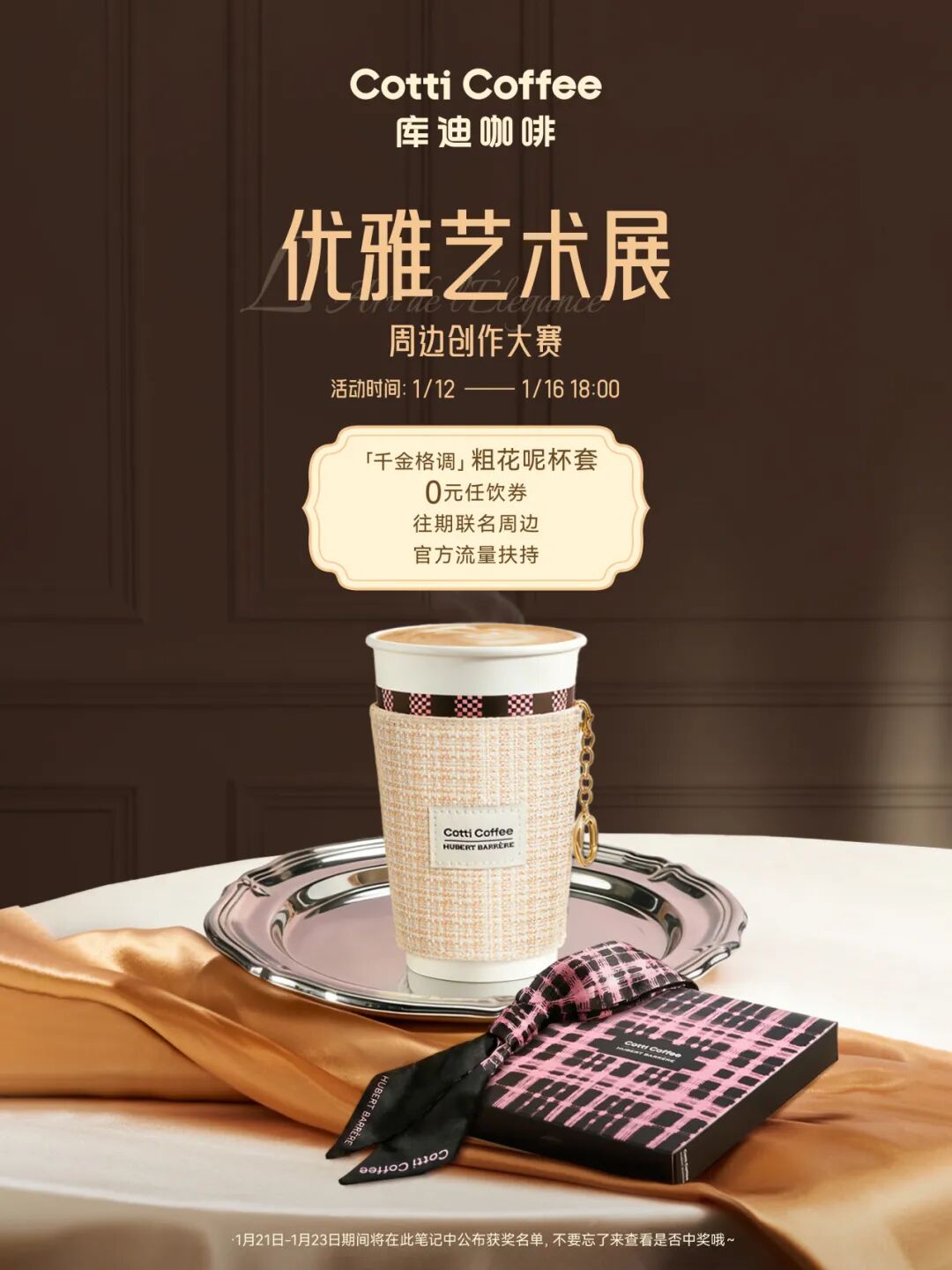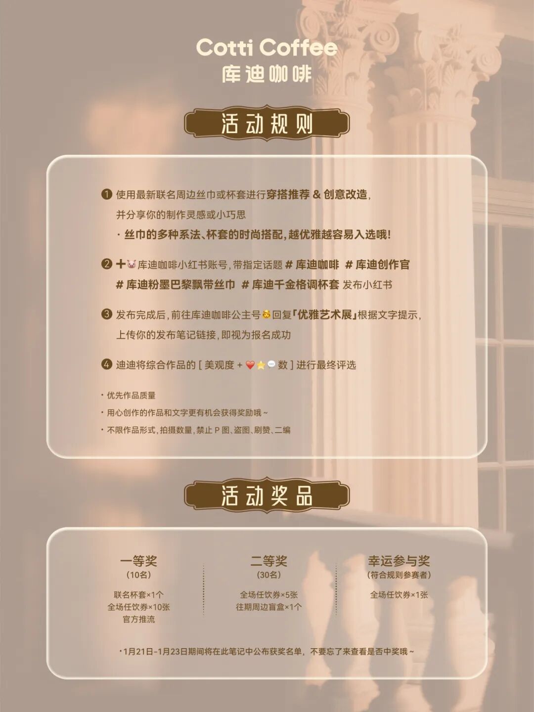 3.关注库迪咖啡小红书账号,带指定话题 #库迪咖啡 #库迪创作官#库迪粉墨巴黎飘带丝巾 #库迪干金格调杯套 发布小红书