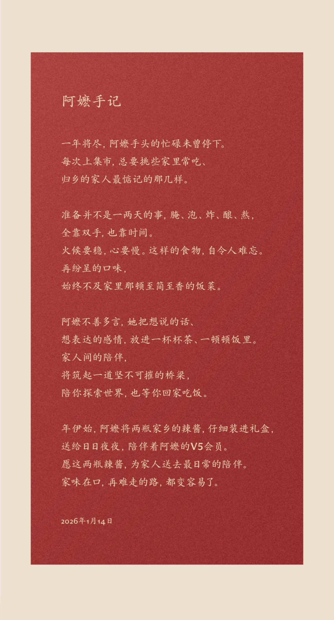 摘要:V5 会员感恩年礼,2026 新年特别心意卡上线。新岁将至,有酱相伴,不孤单。