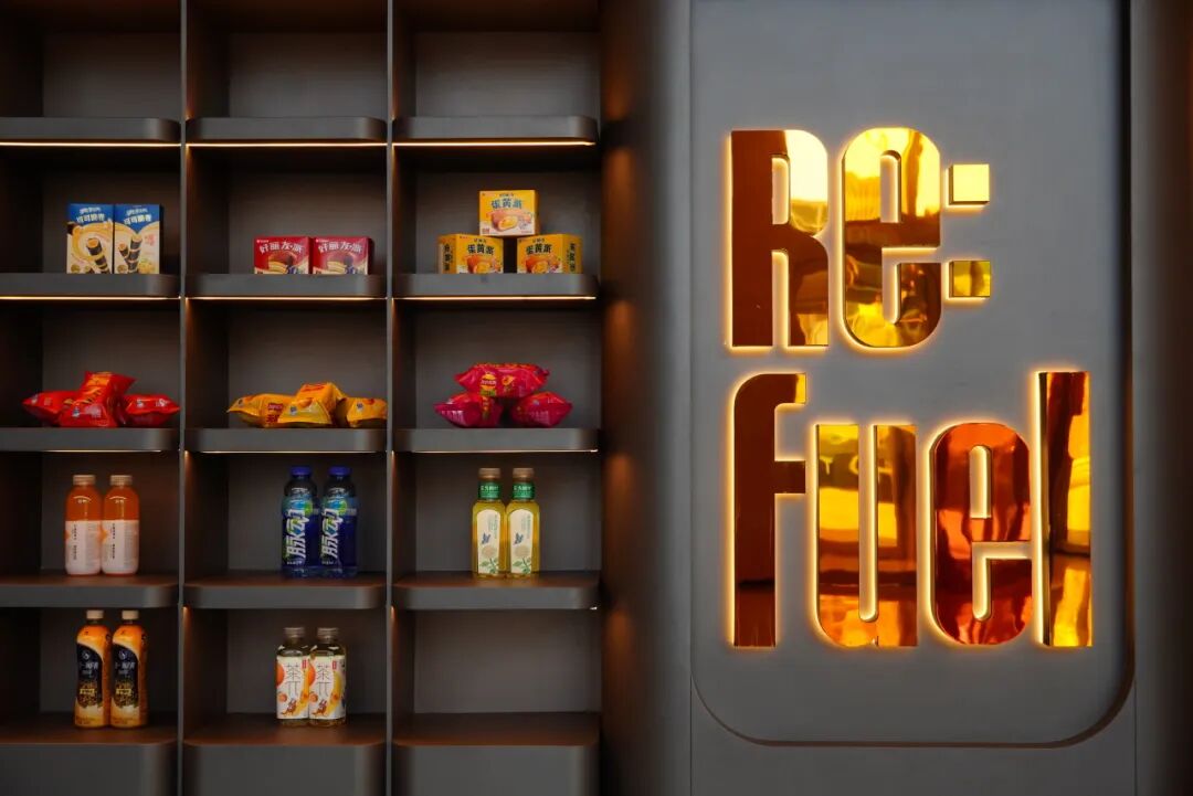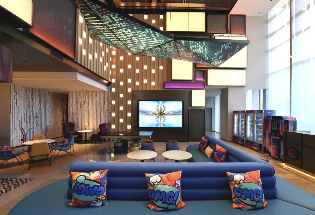 前台、W XYZ 吧与能量站(Re:fuel by Aloft)被整合为一个高度开放的复合空间。挑高尺度与几何色块塑造出舒阔而有张力的空间基调,灵活家具、舞台化灯光及数码艺术共同营造出层次清晰、节奏鲜明的公共氛围。多重功能在此并行却秩序分明,既承担抵达缓冲,也自然延展为办公、社交与夜间小酌等多元使用场景;24小时运营的能量站与雅乐轩标志性的音乐节拍,则让人心安无虞,松弛愉悦。