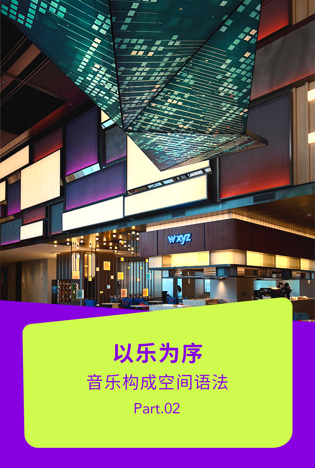 ▶︎前台背景板上雅乐轩logo的演绎与挑空墙壁上靓丽的几何色块相得益彰;W XYZ吧,可围坐吧台,亦可与友人在半私密的卡座小酌。