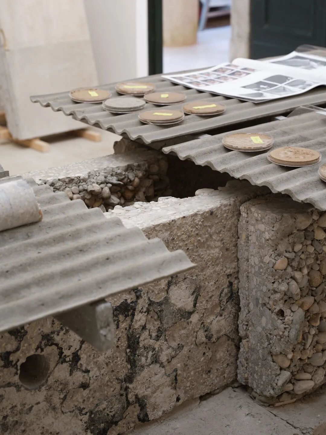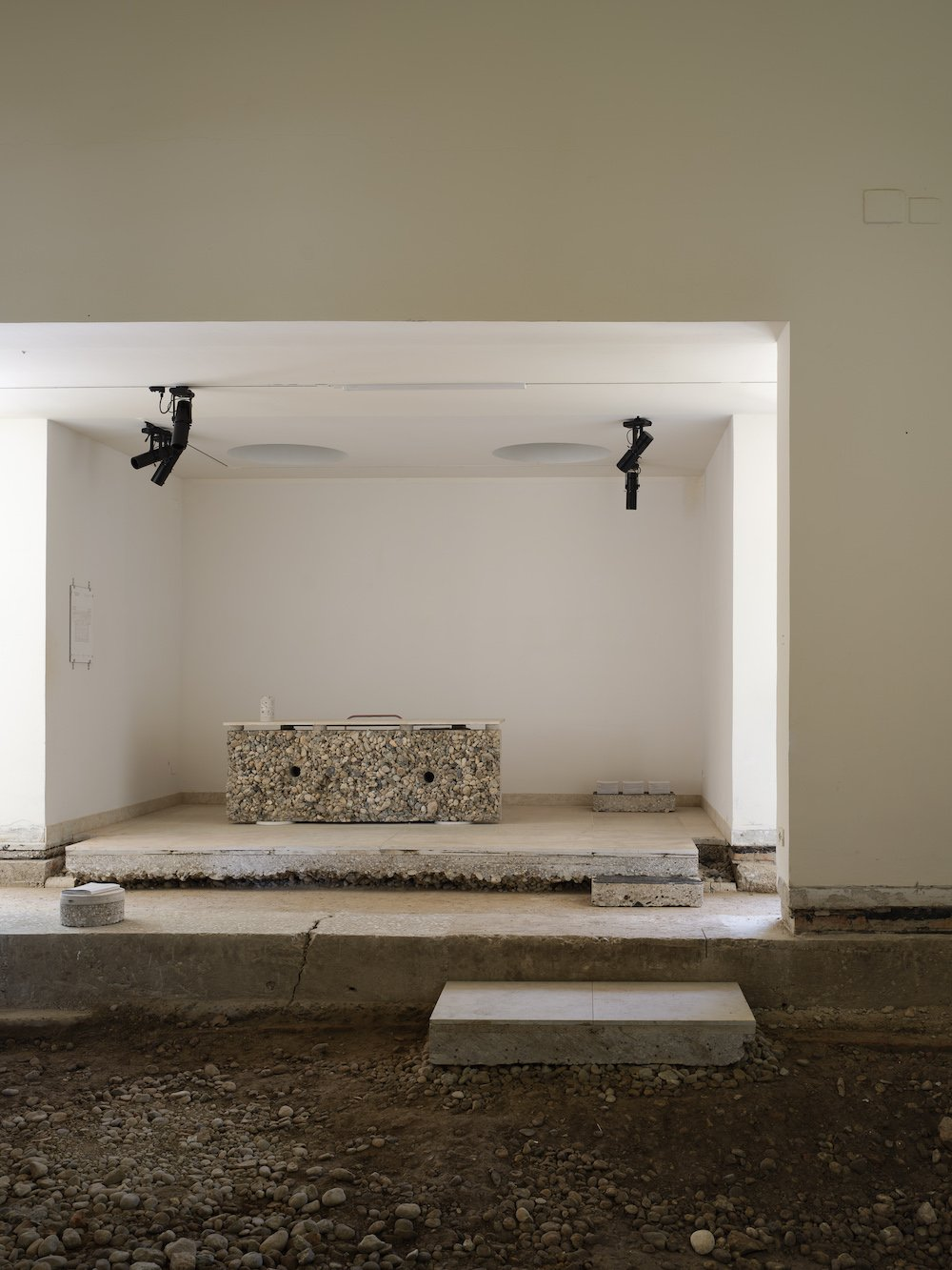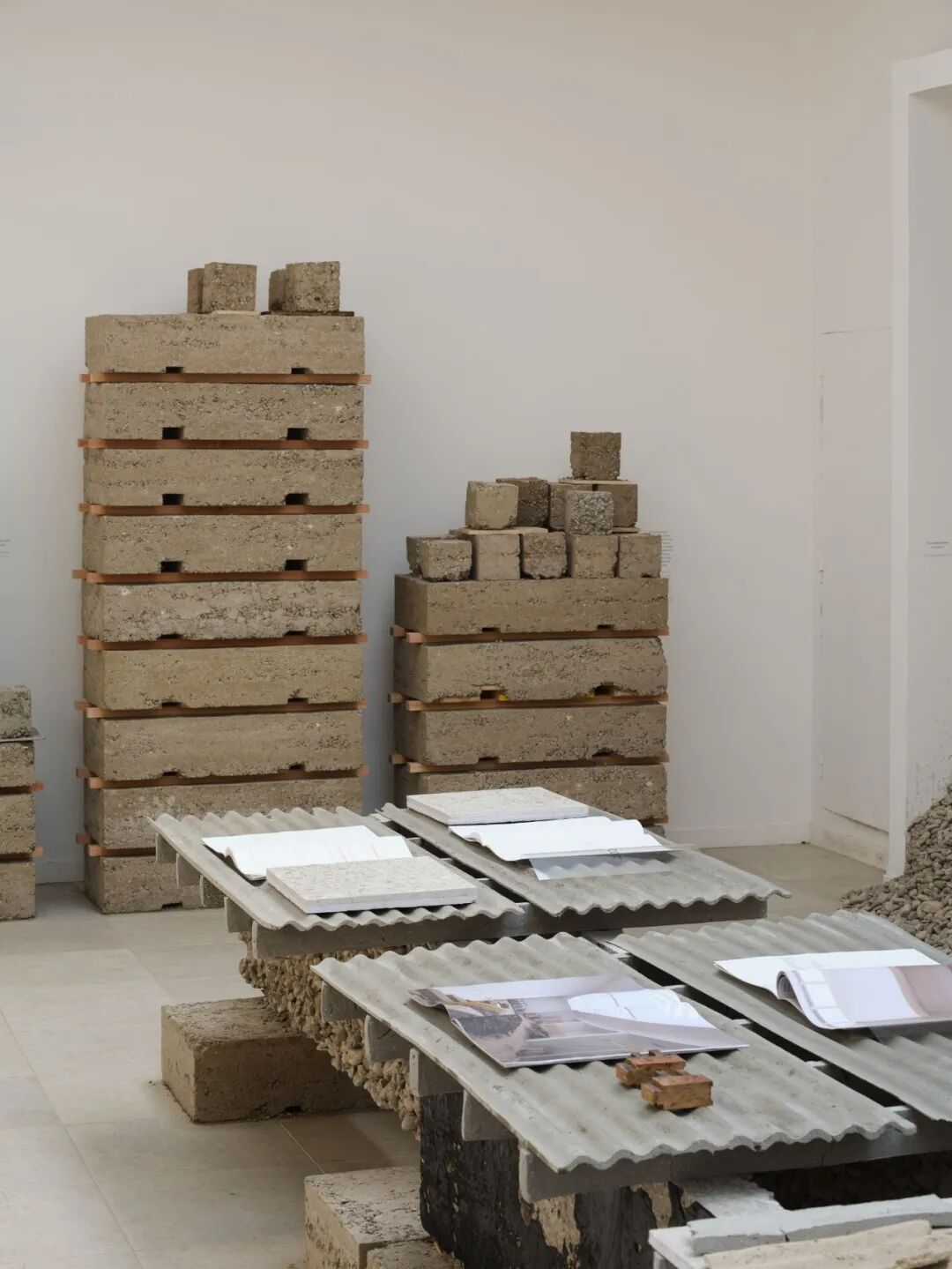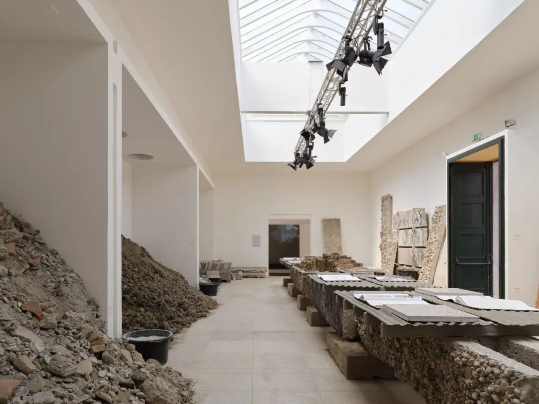 展览“Build of Site”被组织为“建造实验室”和“研究展示区”两个区域。实验室内呈现的是由夯土碎料、裸露混凝土和保留地砖组成的真实施工界面。所有的展览道具也都来自建筑本身:从地基挖出的沙土与明胶按精确比例混合铸造成展示桌台;拆除的石灰岩地砖在评估其断裂风险后重新组装为展台;混凝土楼板被精确切割转化为结构梁……看似临时的元素实则都是经过严密计算的材料实验成果。