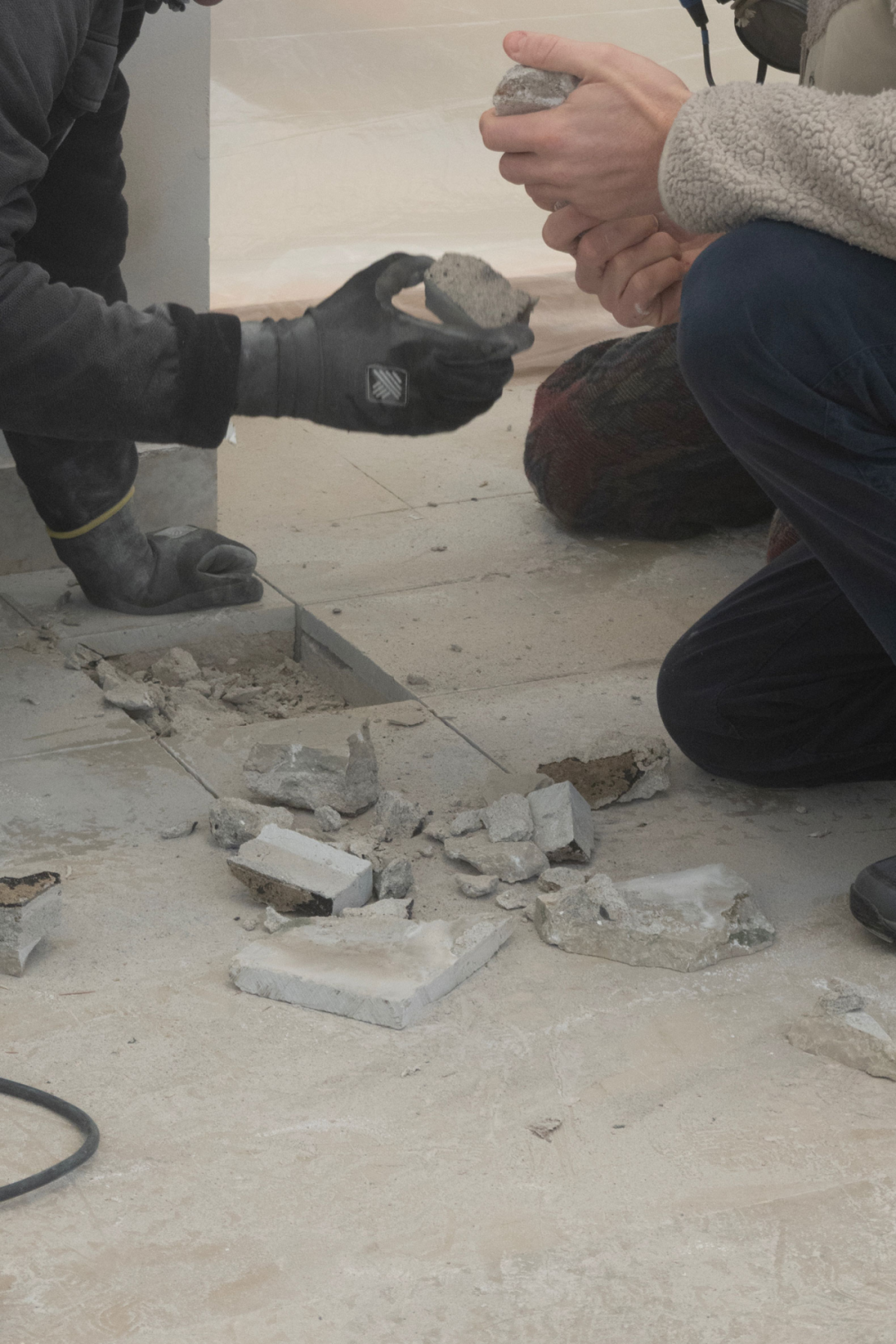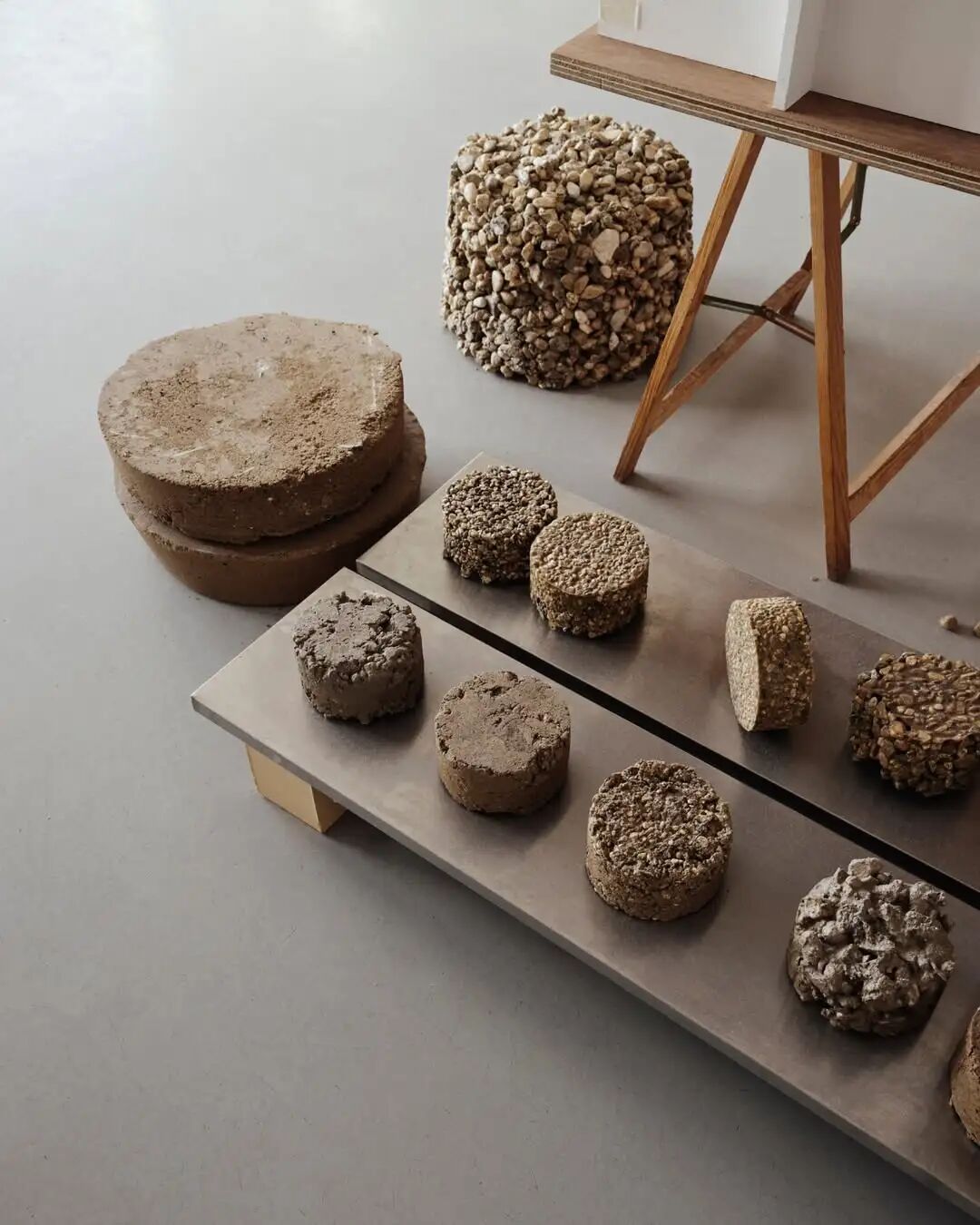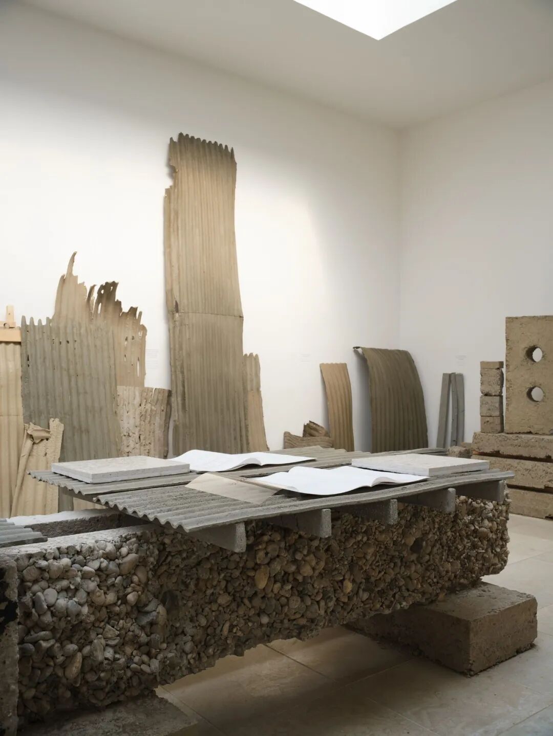 展览“Build of Site”被组织为“建造实验室”和“研究展示区”两个区域。实验室内呈现的是由夯土碎料、裸露混凝土和保留地砖组成的真实施工界面。所有的展览道具也都来自建筑本身:从地基挖出的沙土与明胶按精确比例混合铸造成展示桌台;拆除的石灰岩地砖在评估其断裂风险后重新组装为展台;混凝土楼板被精确切割转化为结构梁……看似临时的元素实则都是经过严密计算的材料实验成果。