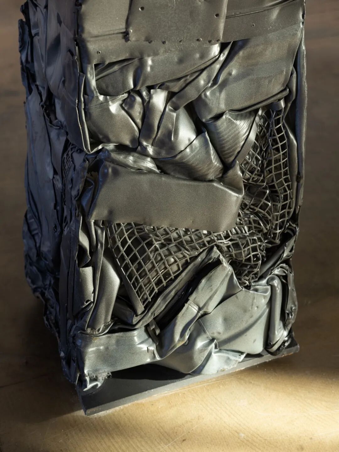 旧的金属通风管道被压制成块状,成为咖啡馆桌子的雕塑式底座