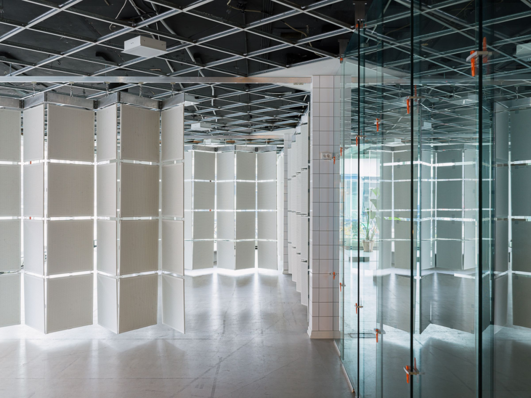 哥本哈根艺术中心天花板上原有铝制网格内的瓷砖被改造成折叠墙。为了简化组装过程,降低成本并方便拆卸,设计使用了常见的开口环和登山扣将吸音板组装在一起。图片来源:©Hampus Berndtson