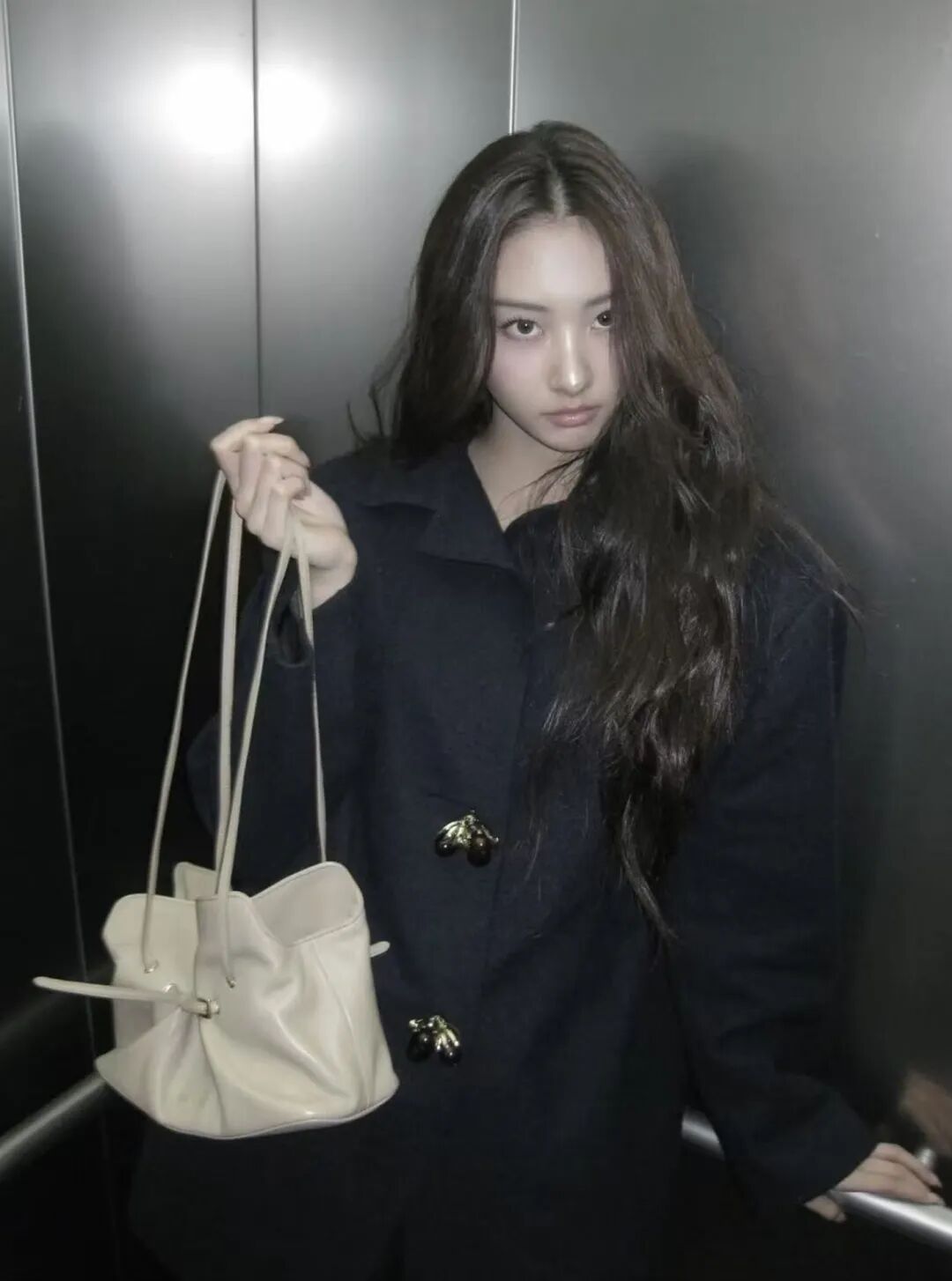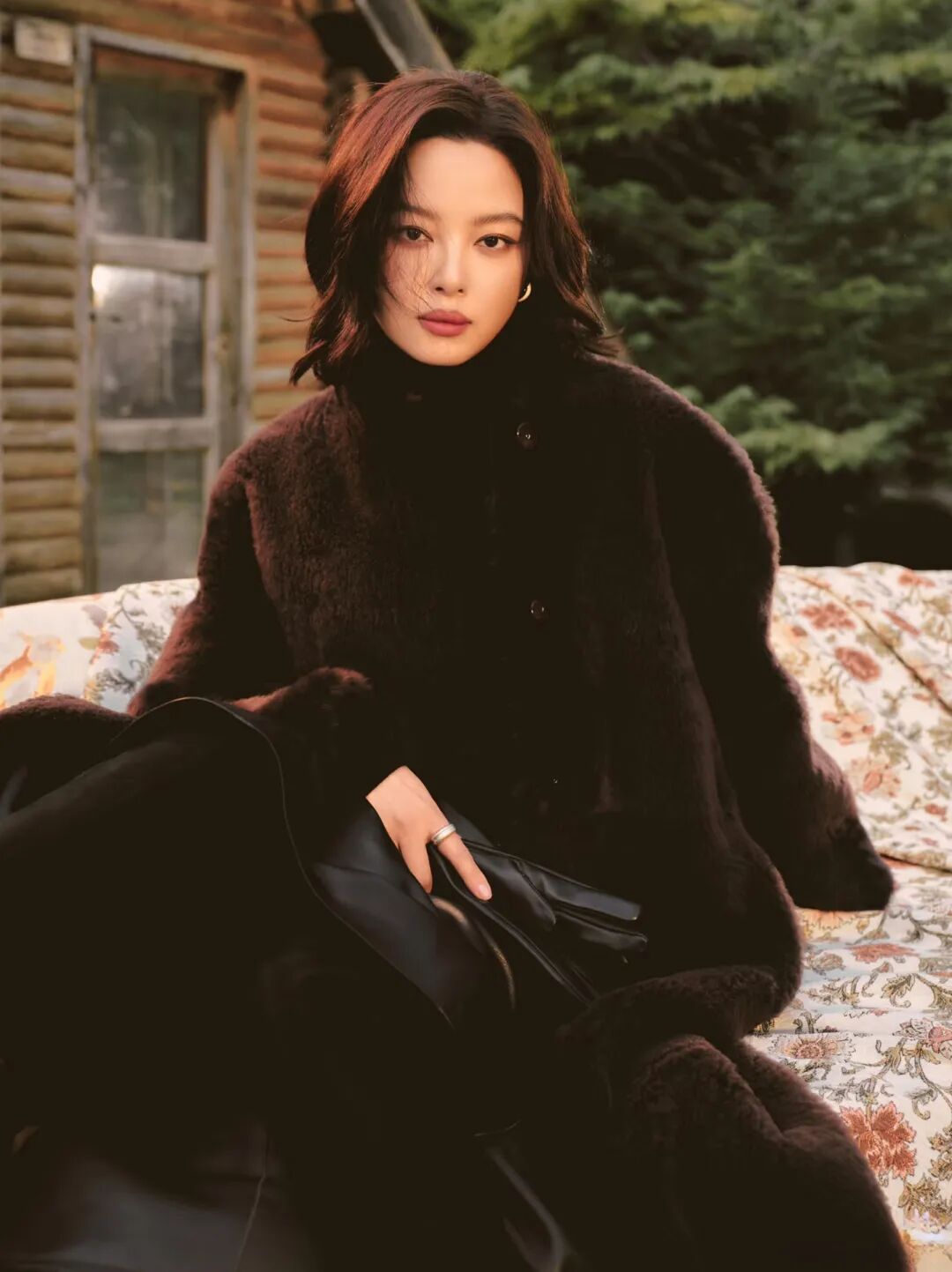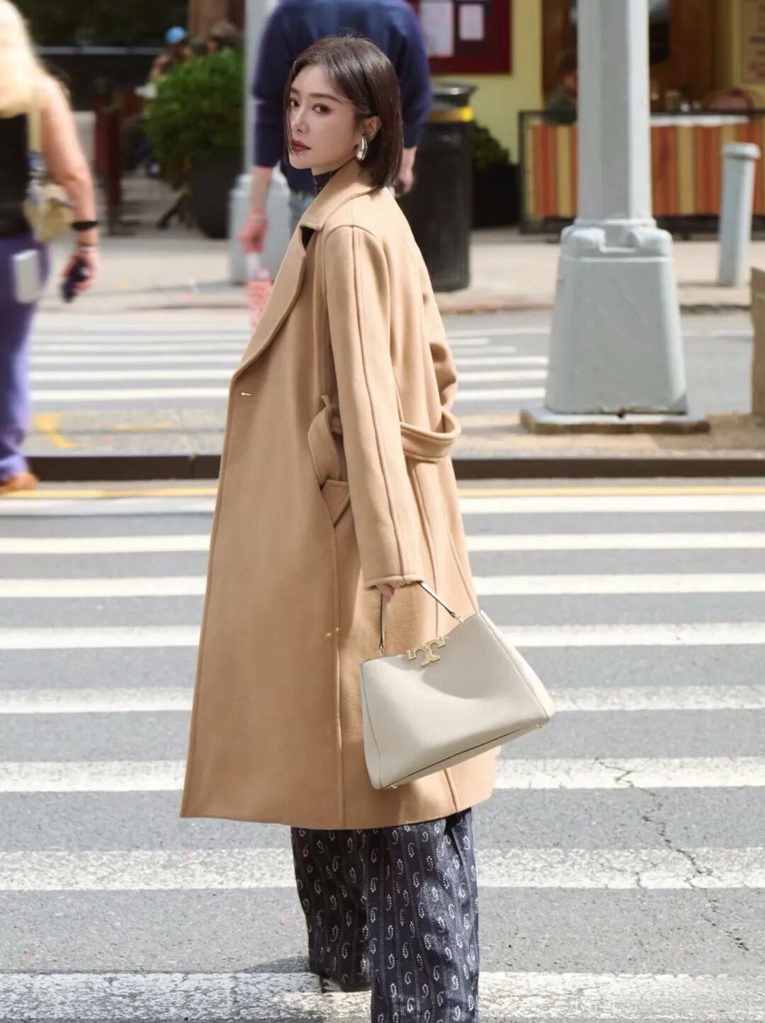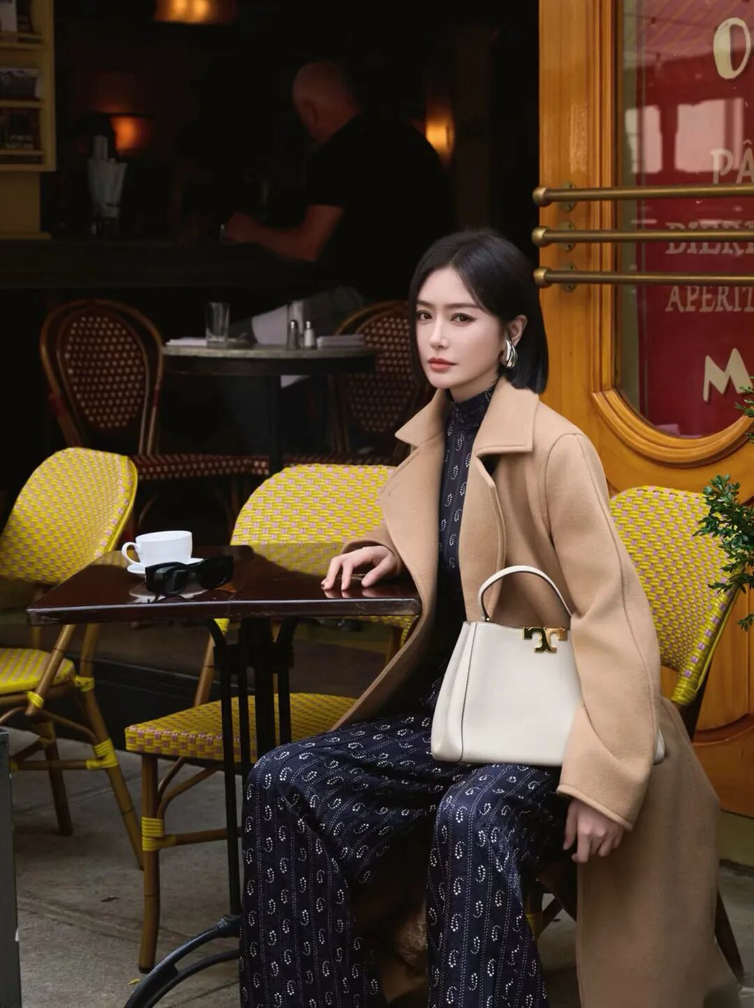 张婧仪身着浅棕色中长款毛呢大衣,内搭黑色紧身真丝衬衫,柔滑面料与毛呢肌理形成材质碰撞,整体色调柔和治愈。配饰选择小巧的珍珠耳饰与同色系皮质包袋,弱化了大衣的厚重感,将温柔与元气平衡得恰到好处,是日常约会与休闲出行的优质参考。