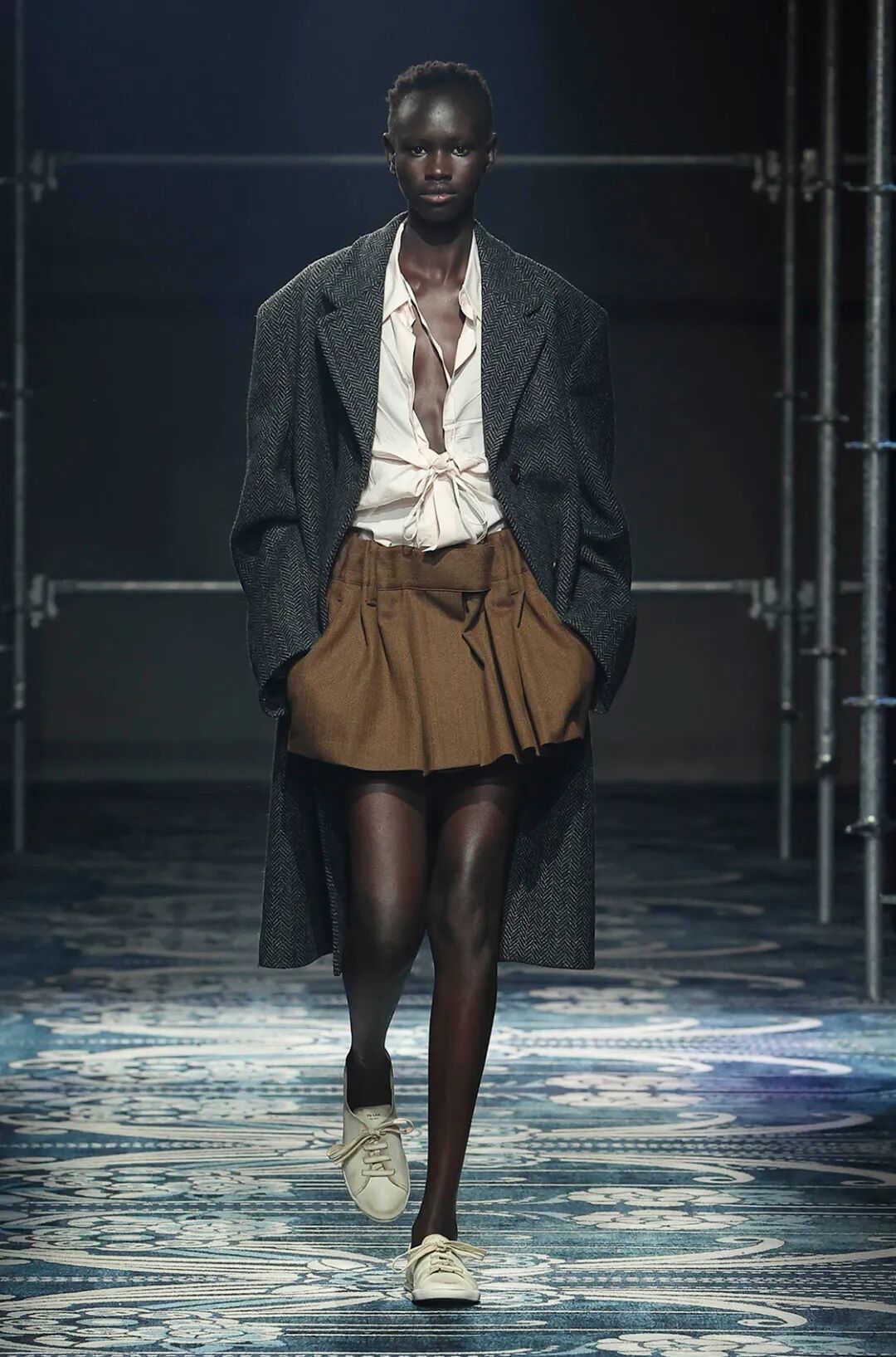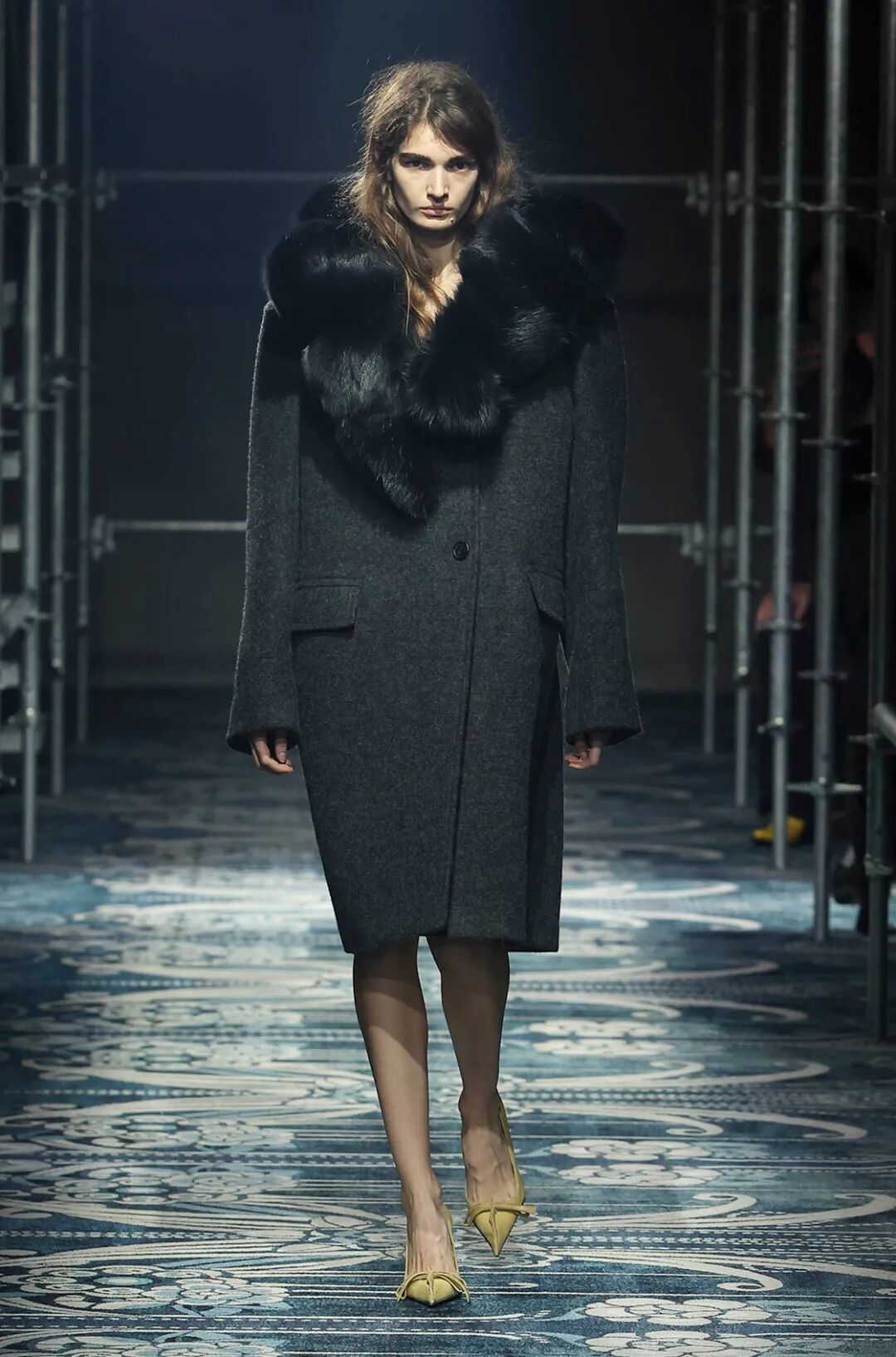 Prada 2025秋冬女装秀中,大衣成了“矛盾美学”的具象载体:深灰羊毛大衣叠接黑色毛领,粗粝肌理与柔滑皮草碰撞出“原始感”与“精致感”的共生;同色系毛呢大衣以金属腰带收束松垮廓形,慵懒里藏着锐利张力;白衬衫系结露肤外罩人字纹大衣,柔硬材质反差消解了厚重;焦糖皮革套装用廓形外套叠短裙,挺括皮质与露肤的冲突让优雅多了叛逆。大衣是Prada式“反精致”的表达,把“不完美”揉进高级感,让每一件既像保护身体的装甲,又像诠释自我的可生长衣橱单品。