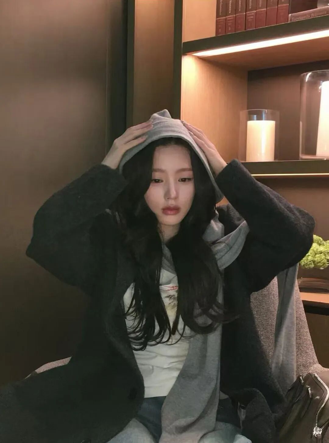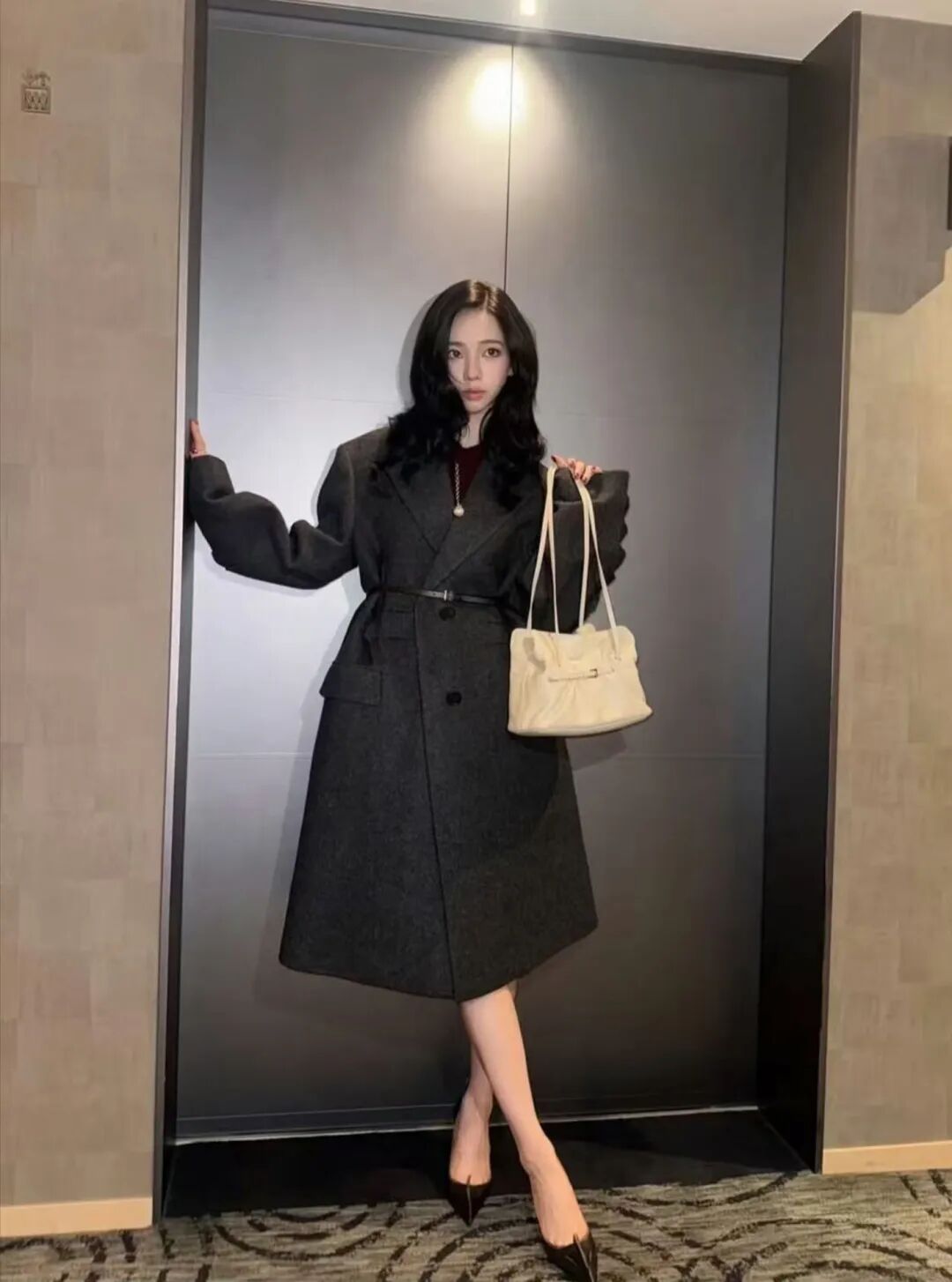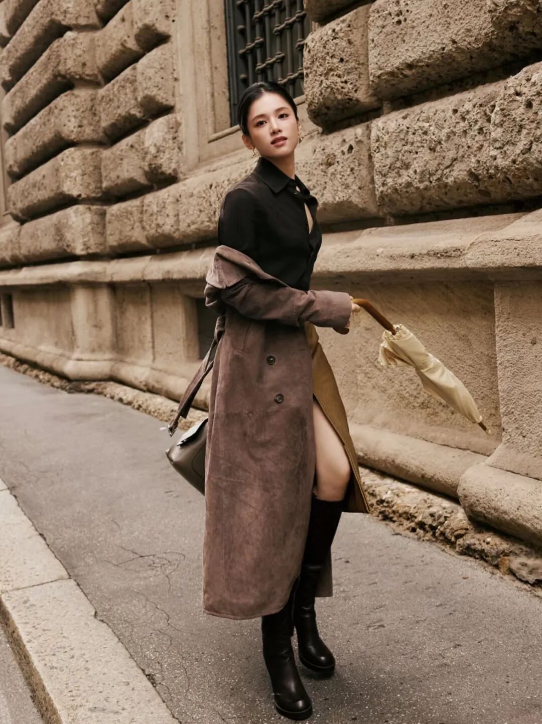 宋雨琦的灰色大衣自带秋冬氛围感,90% 精纺羊毛的挺括质感衬得身形利落不拖沓。内搭浅色系的柔质针织单品,软和的内搭与大衣的挺括形成鲜明材质反差,既兼顾了秋冬出行的保暖度,又让整体造型有了轻盈层次。