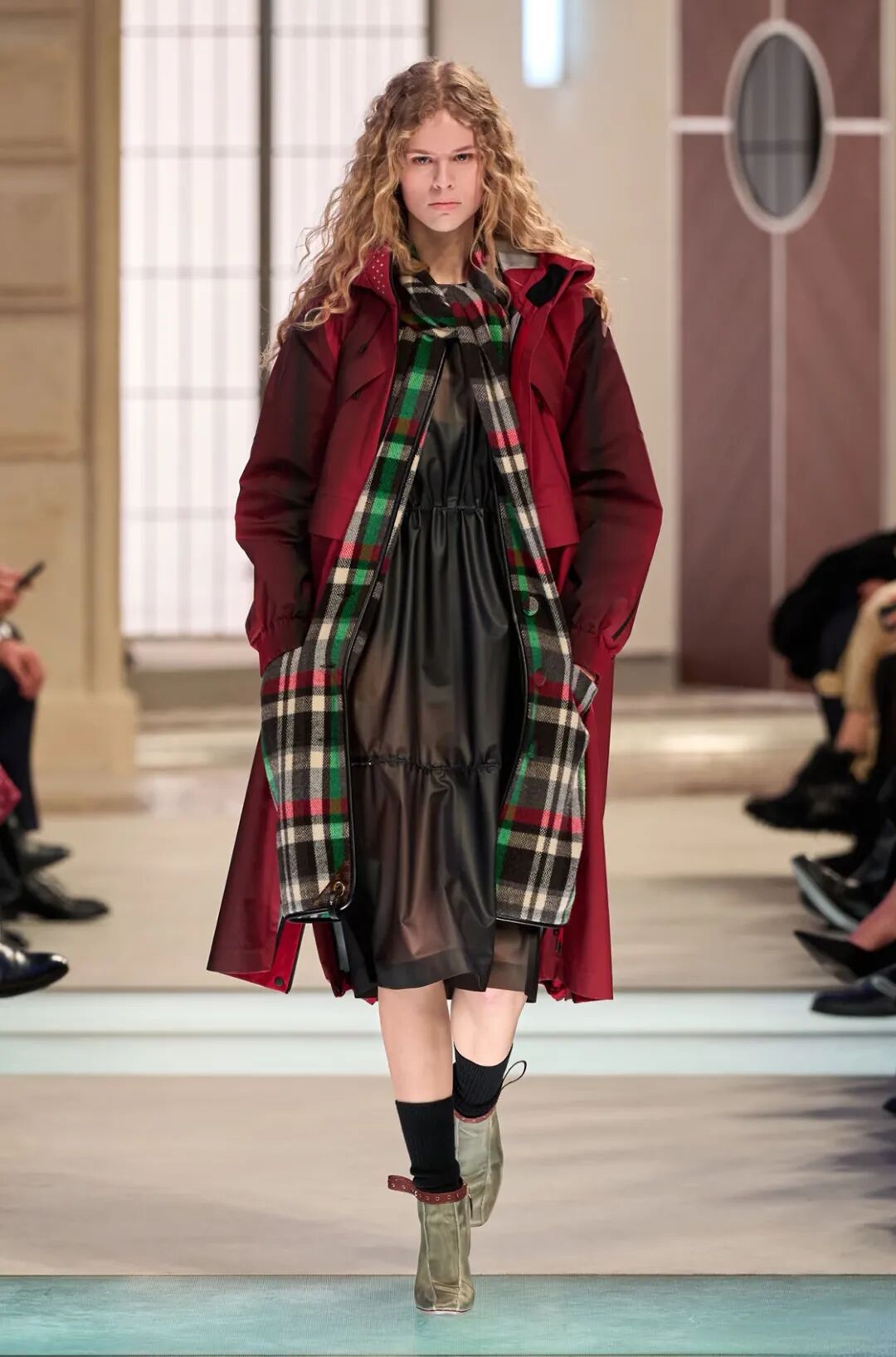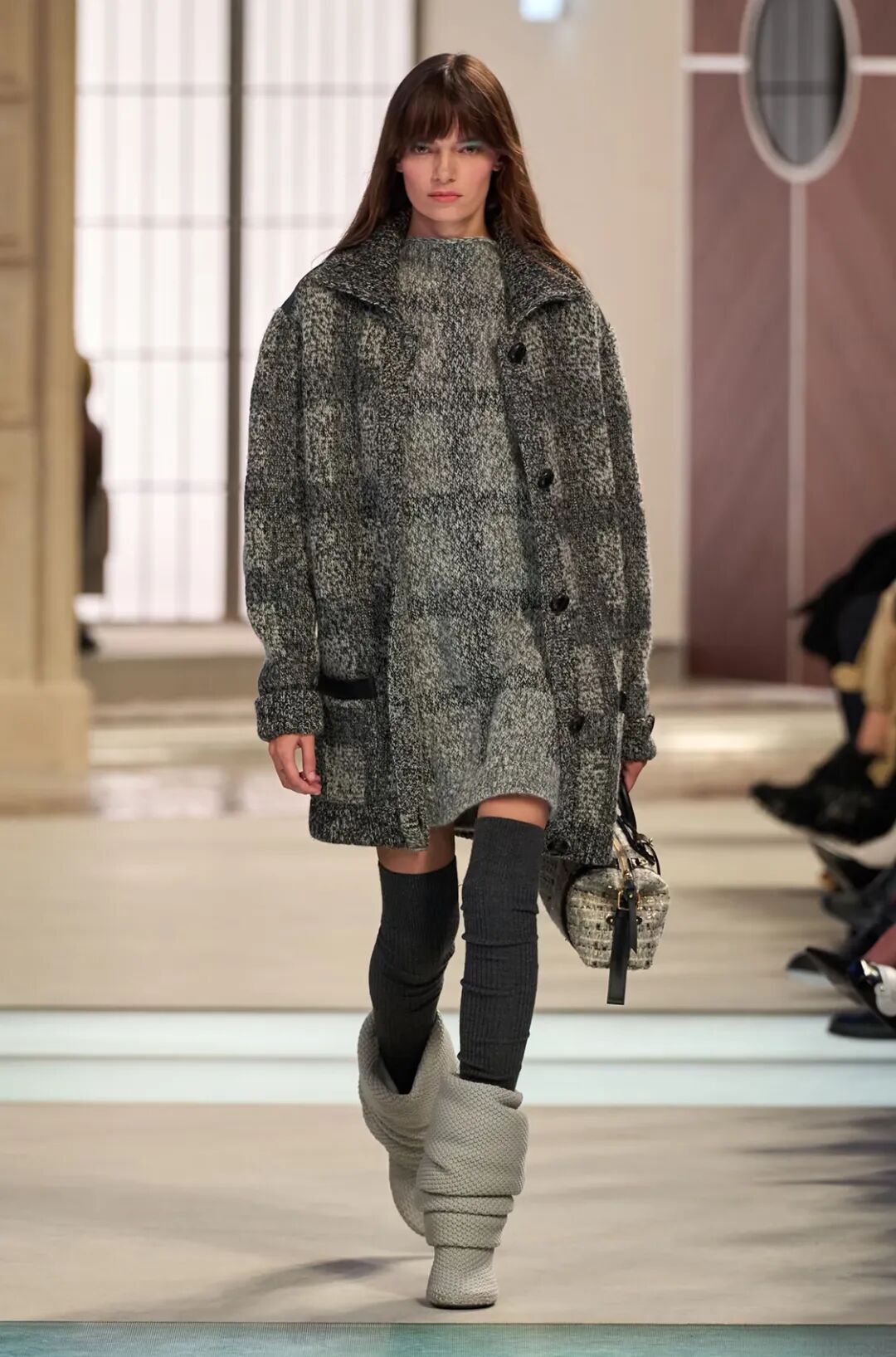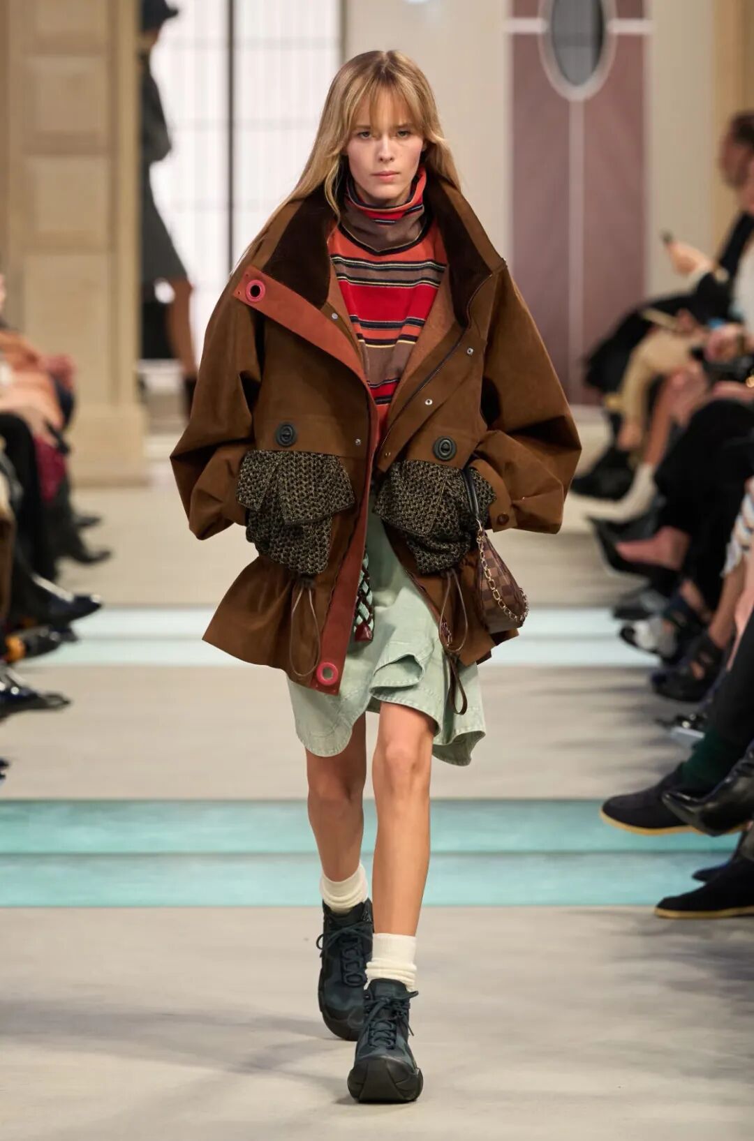 本季 Louis Vuitton 以 “优雅与随性的碰撞” 为核,让大衣成了多元风格的载体:驼色羊毛大衣外搭印花裙装,厚重面料与轻盈裙褶对冲出复古甜酷;酒红冲锋衣式大衣拼接格纹衬里,户外功能性与英式格纹交织出叛逆优雅;麂皮外套嵌粗花呢口袋,复古材质撞街头靴履,让工装感与贵气感自然共生。这季的大衣是 LV 式 “混搭美学” 的延伸,消解风格边界的同时,让每一件大衣都成了能适配都市、户外等多元场景的 “流动衣橱单品”。