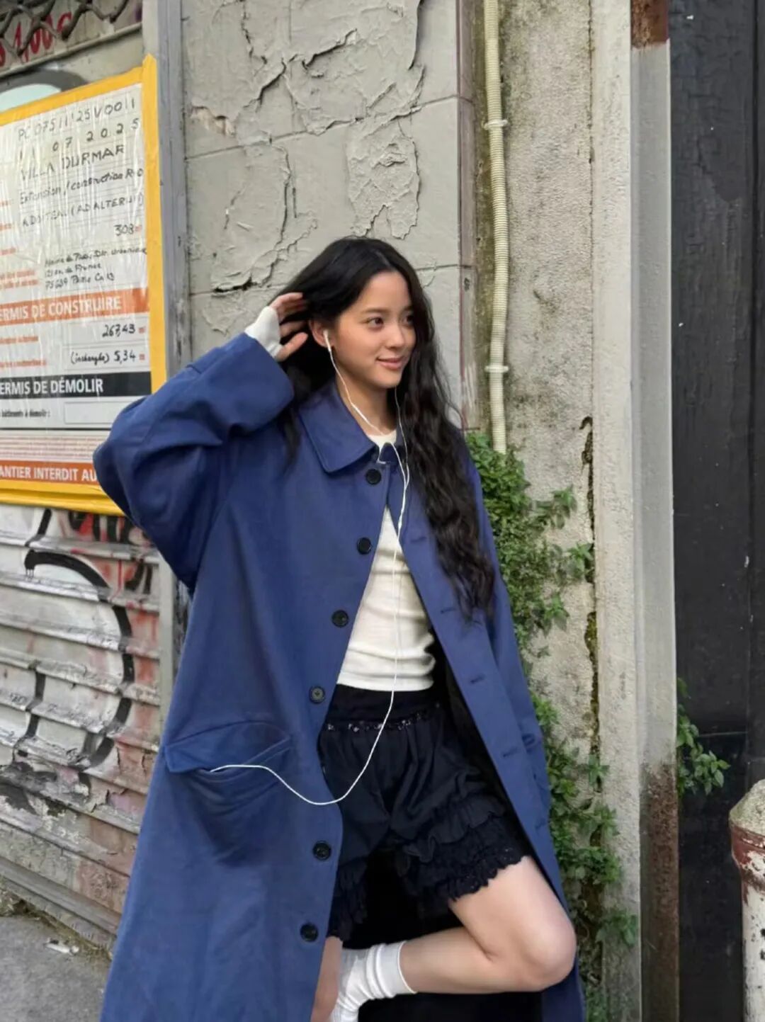 欧阳娜娜的深蓝色长款廓形大衣,柔软挺括兼具,内搭白色修身针织打底,下装配黑色短裤与白袜,风格松弛休闲。这种 “宽松外套 + 修身内搭” 的叠穿逻辑,既靠版型对比避开了冬日穿搭的臃肿感,又以黑白蓝的色彩反差凸显层次,是秋冬日常通勤与休闲出行都很好借鉴的搭配思路。