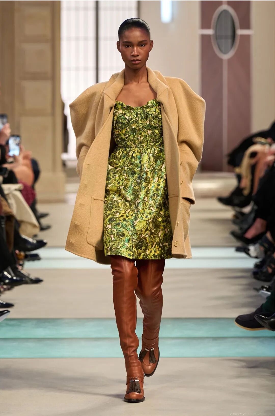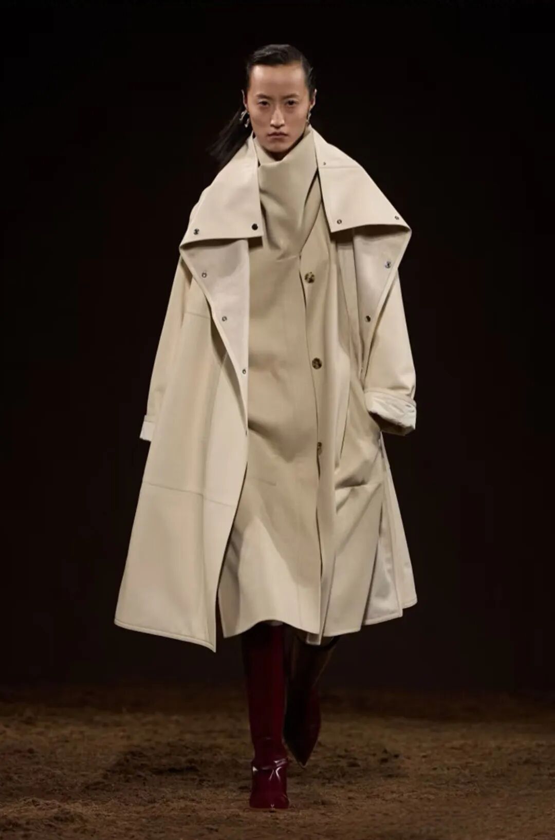 本季Hermes以马术为底,让大衣成叠穿核心:米白皮质风衣叠同色系内搭,低饱和肌理撞出低调层次;炭灰羊毛大衣拼皮革裁片,刚柔反差消解堆砌感;橄榄绿麂皮外套顺色叠皮裤,深浅光泽衬出同色系高级感。马术元素让防护与优雅相融,无浮夸符号,只凭材质、廓形的层次默契,把大衣叠穿做成了质感衣橱。