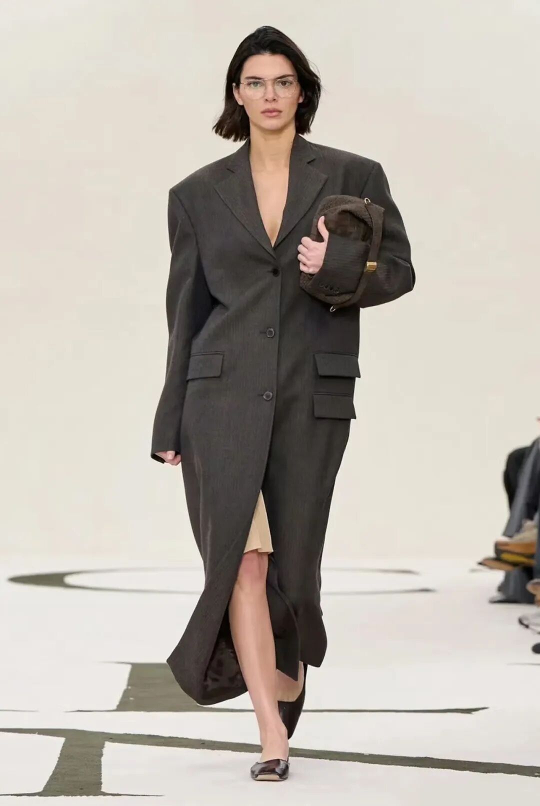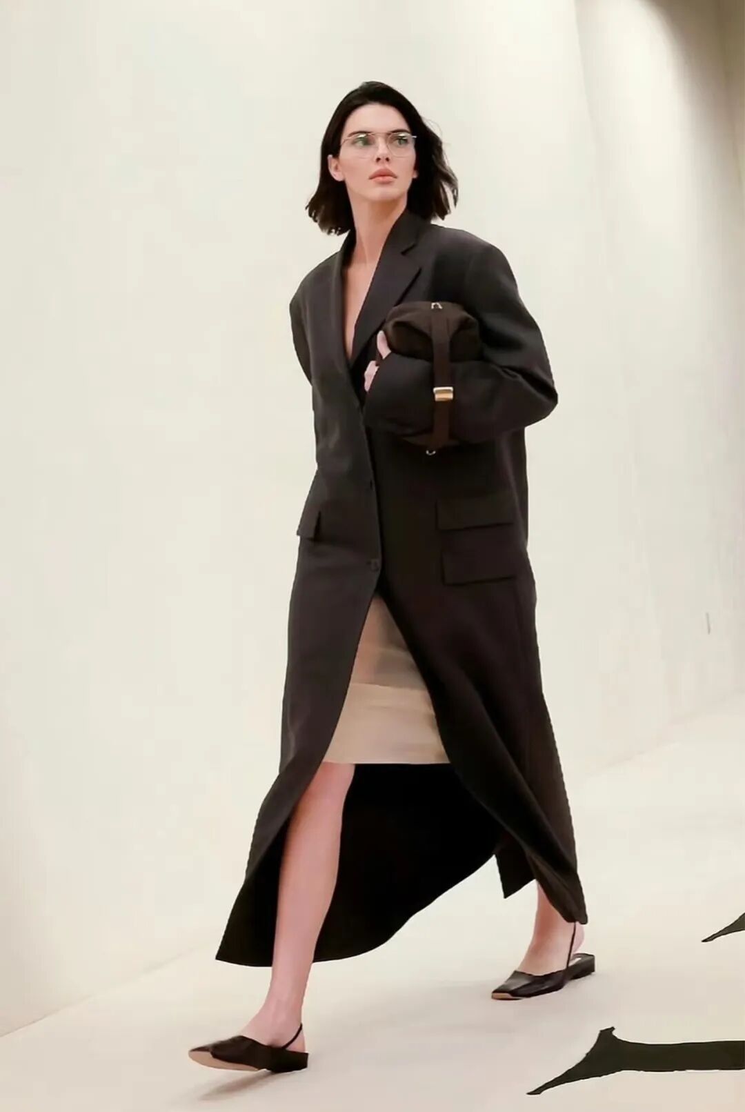 Kendall Jenner 的这身穿搭堪称极简高级风的典范:黑色长款廓形西装大衣作为核心,内搭浅米色修身缎面裙装,搭配黑色穆勒鞋,基础色系统一调性。宽松大衣与修身内搭的版型反差构建层次,80% 羊毛的挺括面料与丝质缎面的柔滑光泽相互映衬,既显大气气场,又可作为时装场合或日常通勤的进阶穿搭模板,尽显不费力的高级感。
