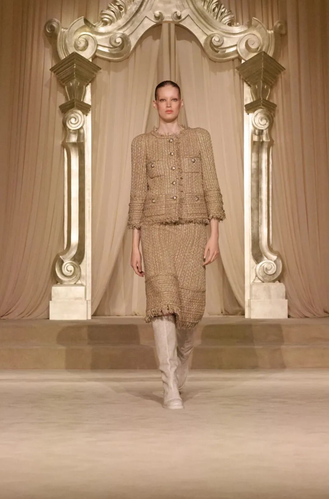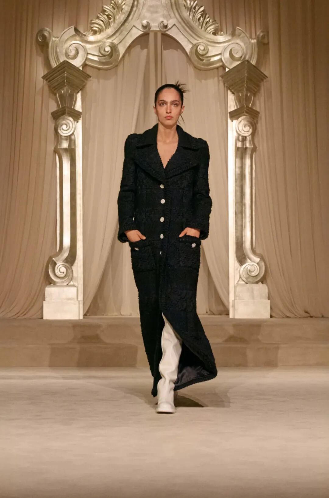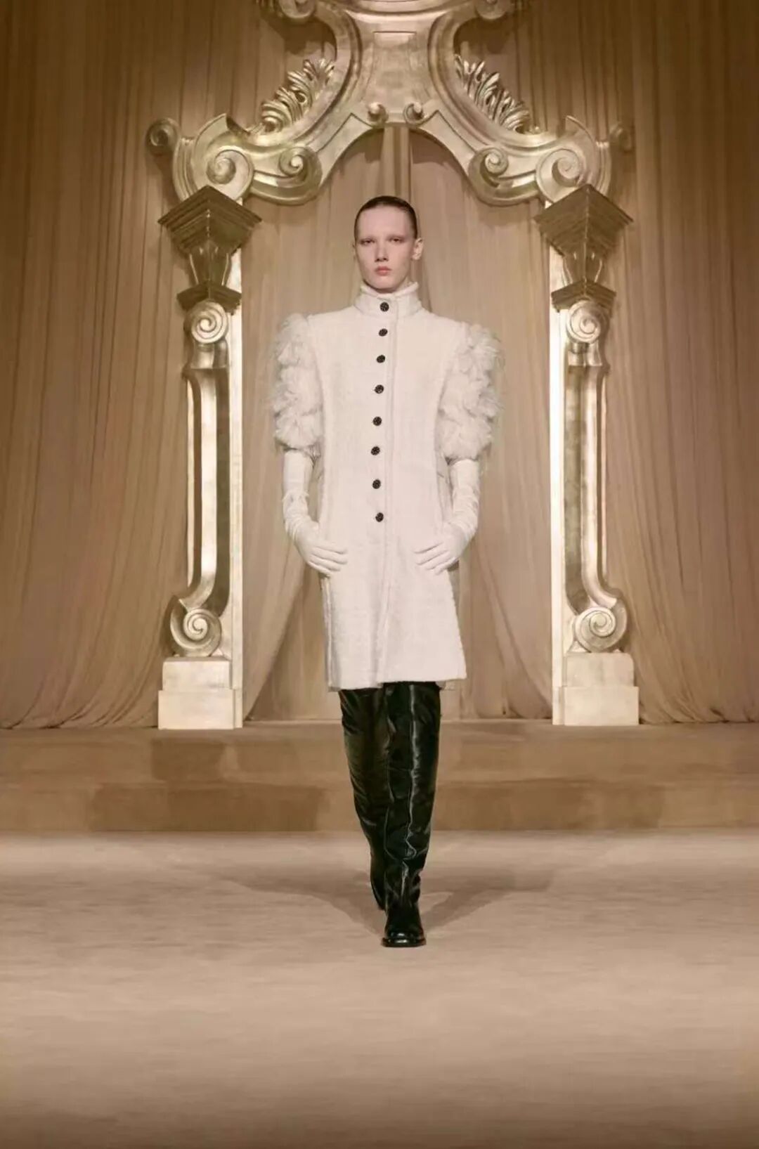 本季 Chanel 将标志性粗花呢大衣拽出经典框架,在巴洛克风秀场里酿出 “复古与锐利” 的共生:米白粗花呢大衣缀羽毛肩袖,柔糯肌理裹着宫廷式蓬松;酒红粗花呢套装以毛边流苏勾边;浅金粗花呢套装配同色系靴履;黑色长款粗花呢大衣嵌珍珠扣,挺括廓形露白靴边,冷艳里藏着轻盈。这季的大衣是 Chanel 式 “华丽解构”,经典面料揉进先锋廓形,让每一件既带着品牌的基因烙印,又成了能穿梭于晚宴与街头的 “流动艺术品”。