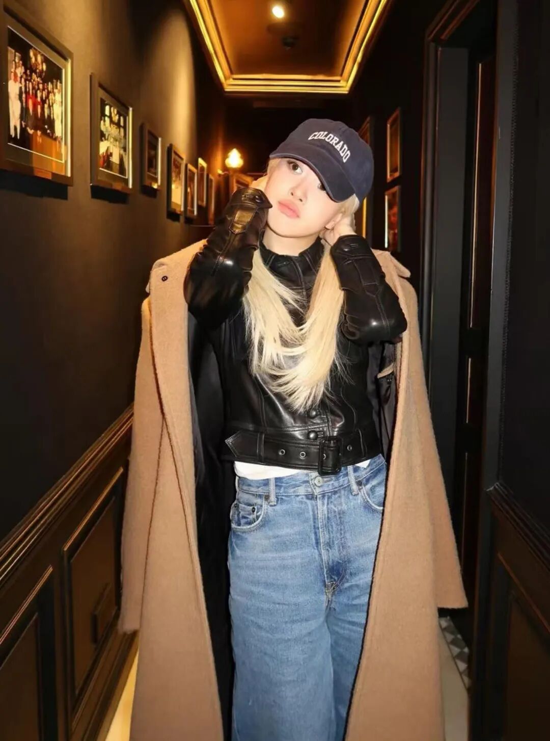 材质的碰撞,是叠穿营造层次感的核心密钥。挺括的皮衣外套叠穿软糯针织内搭,硬朗的皮质肌理与柔润的针织触感形成鲜明对比,打破单一材质的沉闷;